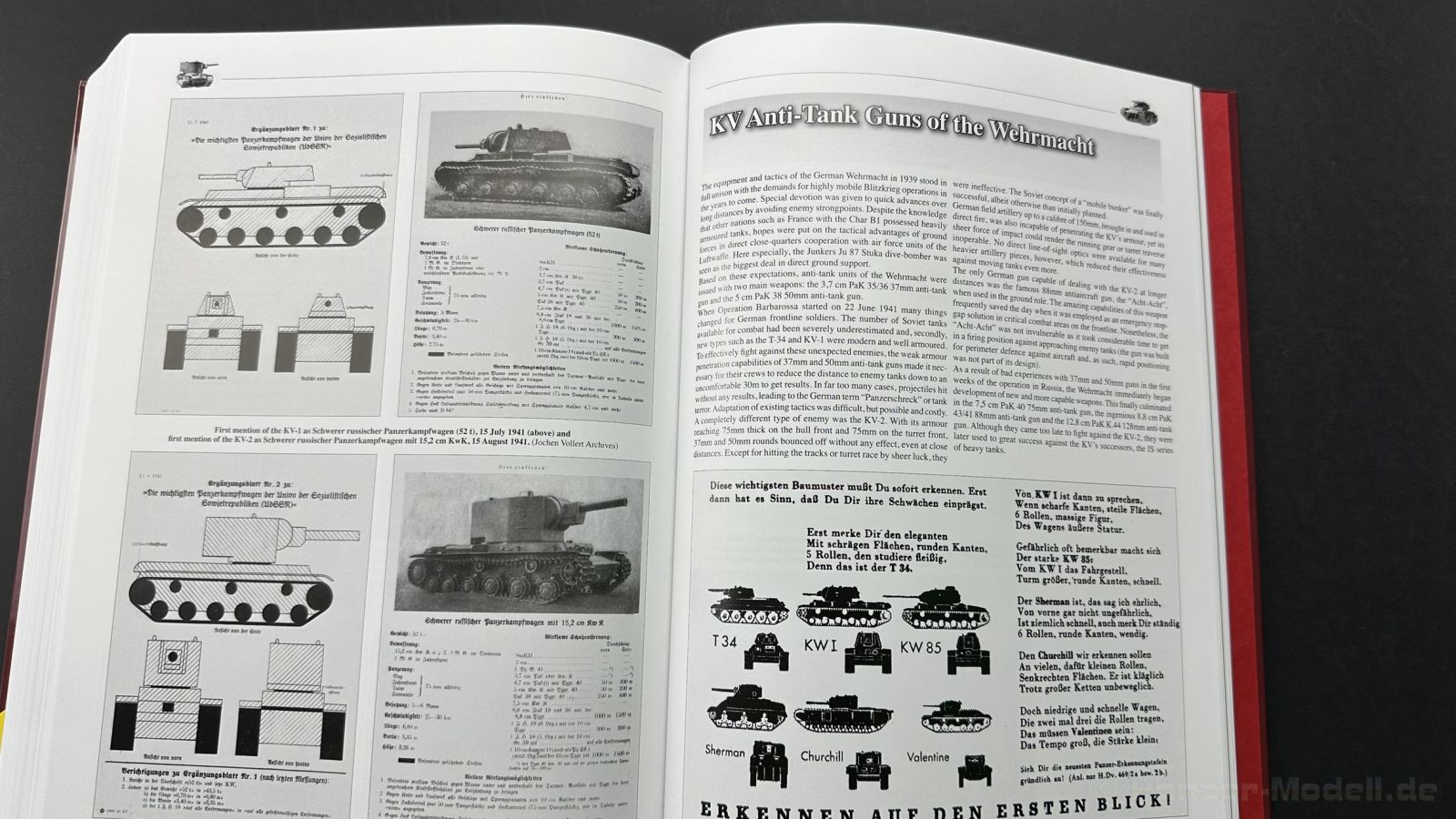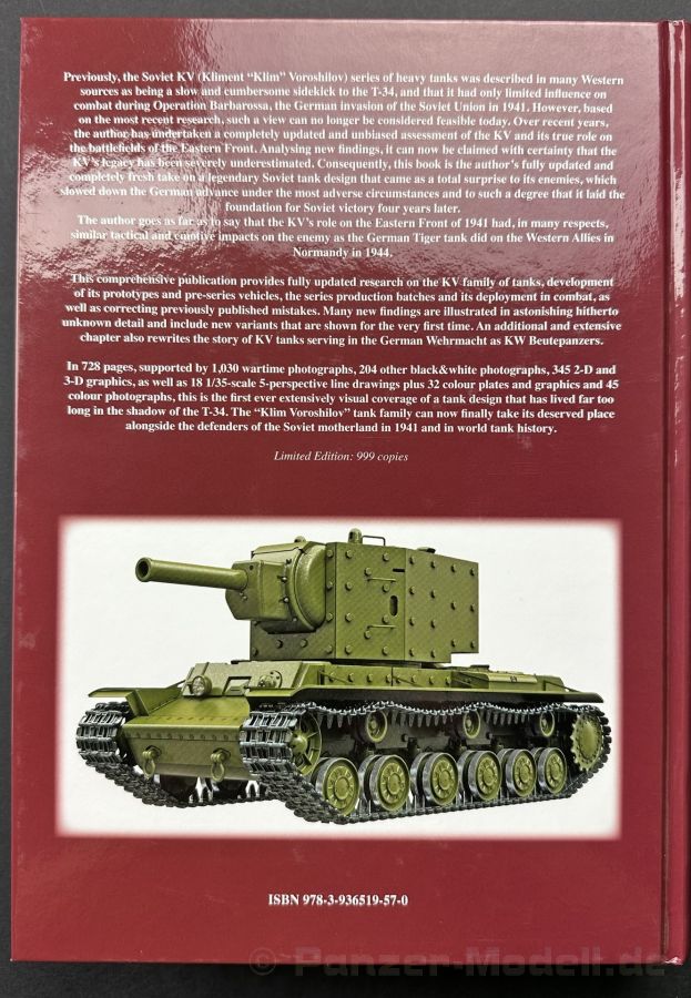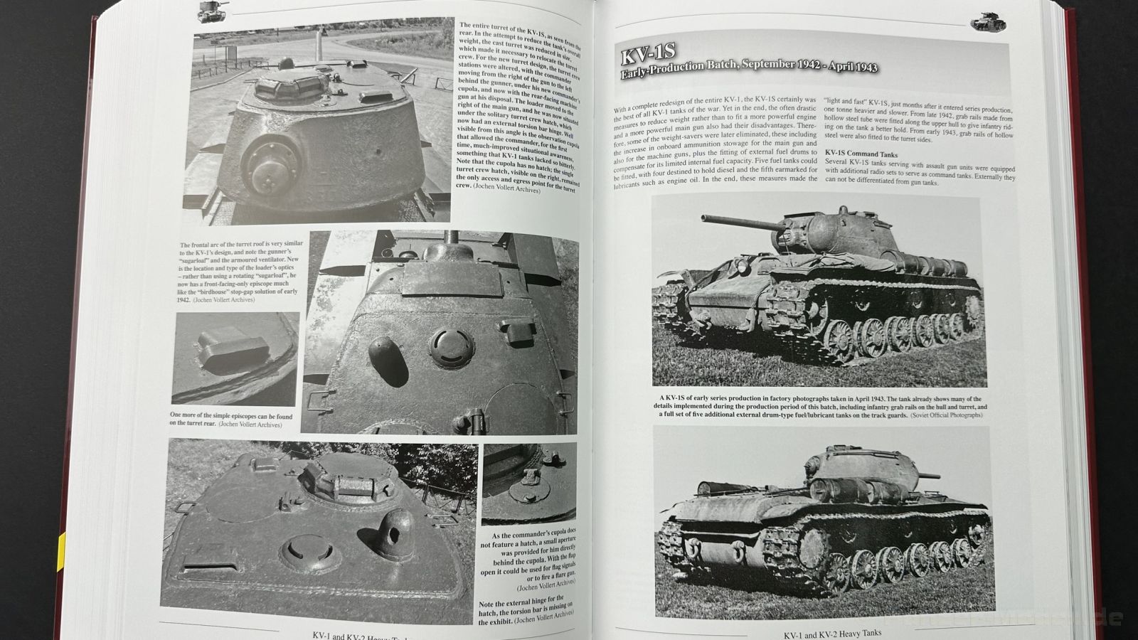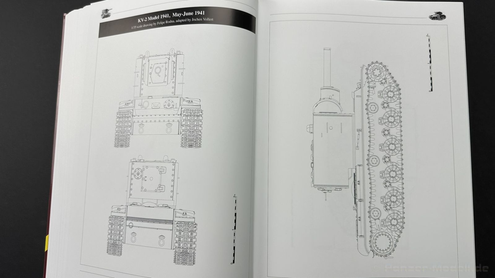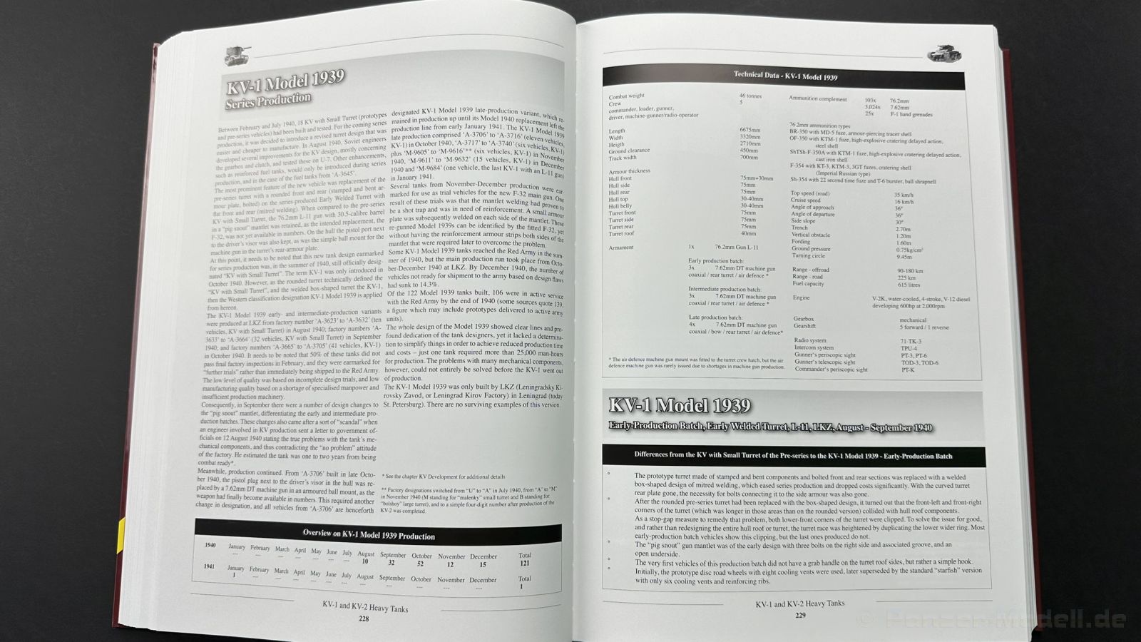 Hier habe ich das ultimative Nachschlagewerk zum Thema KV Panzer zur Vorstellung. Aber kommen wir zuerst zu den Eckdaten In dem Festeinband finden wir 728 Seiten, durchweg auf Hochglanzpapier mit 1030 Bildern, dazu kommen etliche Zeichnungen, Tabellen, einige Farbbilder und Colourprofile. Erwähnenswert ist dass die Zeichnungen in 1:35 angefertigt worden sind, das erleichtert dem geneigten Modellbauer doch erheblich seine Recherche bzw. Umbauten oder Korrekturen. Die Sprache ist leider ausnahmslos in Englisch gehalten, was dem begrenzten deutschen Markt zu Grunde zu führen ist. Wo wir bei begrenzt sind, schnell sein lohnt sich, das Buch ist auf 999 Exemplare limitiert, die Anzahl wird strikt von Herrn Vollert eingehalten. Das Buch gliedert sich wie folgt, nach der obligatorischen Danksagung folgen 3 Seiten, die den Inhalt umschreiben, das ist schon einmal eine Ansage! Es folgen insgesamt 25 Kapitel die Entstehungsgeschichte der KV-Serie wird eingehend beleuchtet sowie die einzelnen Typen, Prototypen, KV1 Model 1939,1940,1941, 1942, die KV2 Serie, KV-1S bis 85mm Version, Flammwerfer Varianten. Spezialaufbauten und natürlich deutsche Beutepanzer werden hier eingehend beleuchtet. Das Buch ist nicht nur für den Militärhistorisch Interessierten von Belang sondern gerade der Modellbauer wird hier mit Maßstäblichen Zeichnungen in 1:35 bedacht. Das hilft sein Modell den historisch korrekten Feinschliff zu verpassen. Der Beute Panzer Teil zieht sich durch diverse Kapitel, wirklich spanend beschrieben und startet mit der Sichtung durch dt. Truppen, die Bekämpfungsmöglichkeiten und natürlich die Erprobung in Deutschland sowie die Umbauten, die durch deutsche Truppen vorgenommen worden sind. Was mir bisher nicht bekannt war, dass es eine Reihe von Dummies gegeben hat, um Einheiten zu trainieren oder einfach um den Gegner zu verwirren. Abgerundet wird das Buch von vielen Colorprofiles aus der Feder von Felipe Rodna, neben russischen Tarnschemen, finden wir auch Tarnungen der Wehrmacht. Abschließend lässt sich sagen, aufgrund der immensen Datenlage, der meist scharfen Bilder, Tabellen, Profilen und der Aufarbeitung der einzelnen und jemals Entwickelten Varianten der KV-Reihe ist es DAS Buch zum Thema. Ich denke aufgrund der limitierten Auflage und des hohen Preises wird das Buch sicherlich noch an Wert gewinnen. Einziges, minimales Manko, in Deutsch wäre der Lesefluss doch ein wenig leichter gefallen