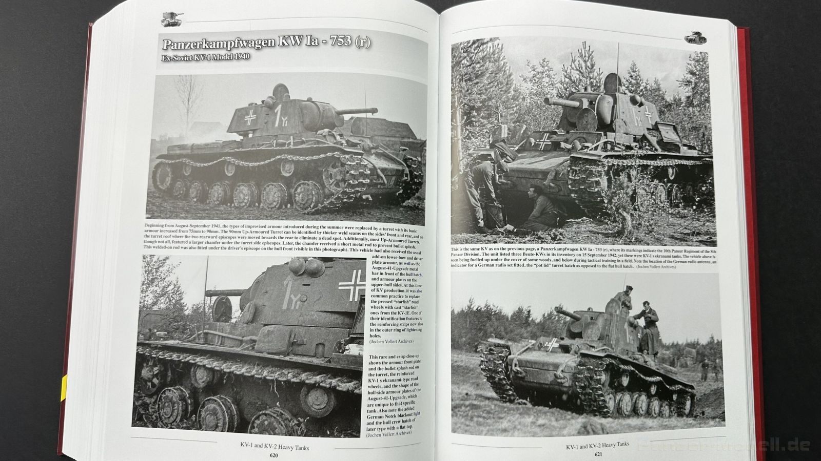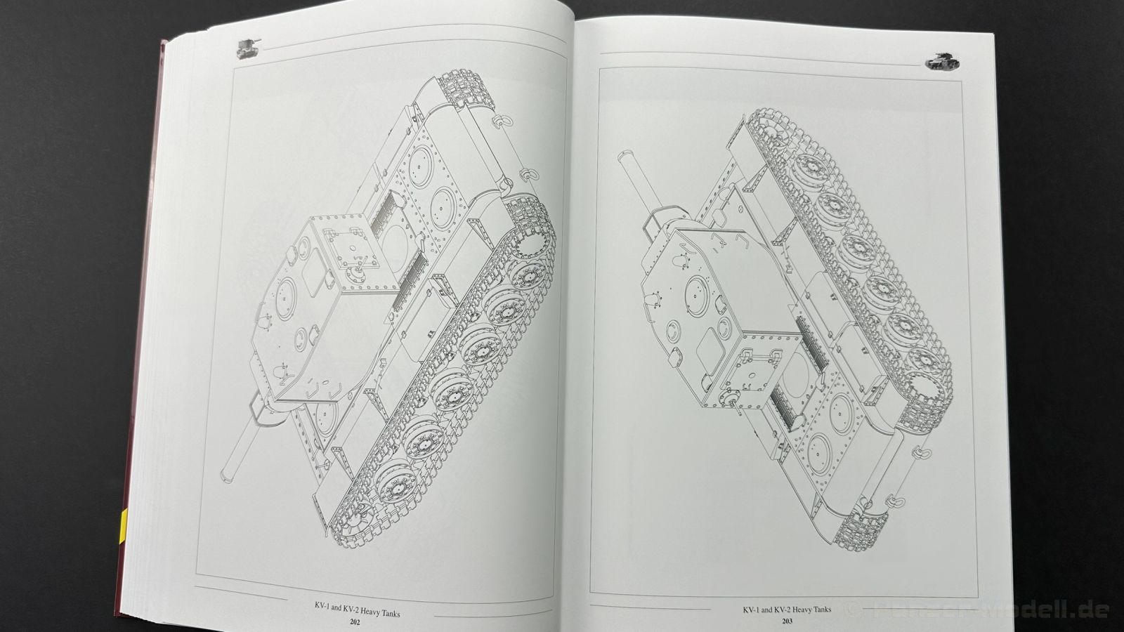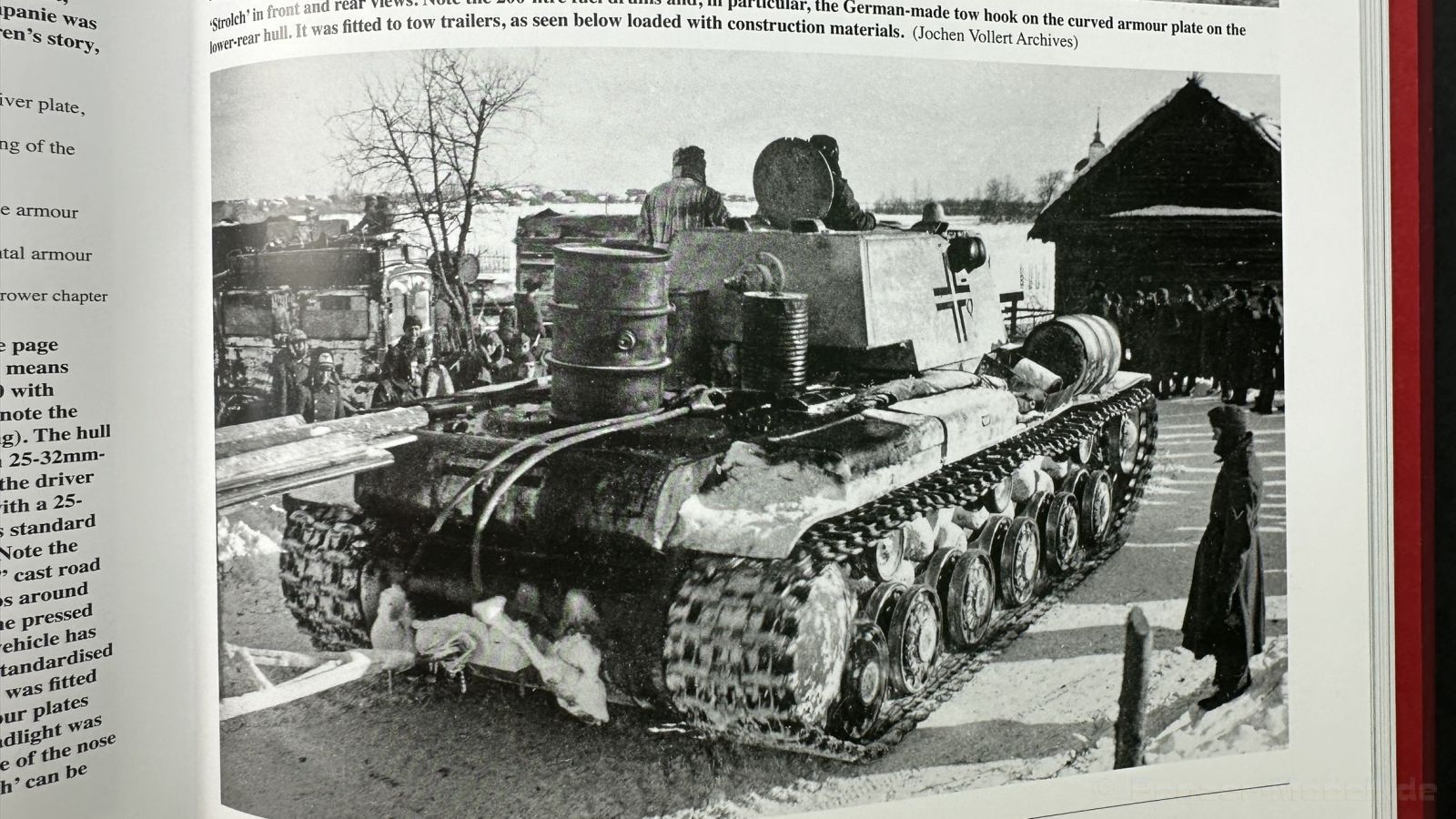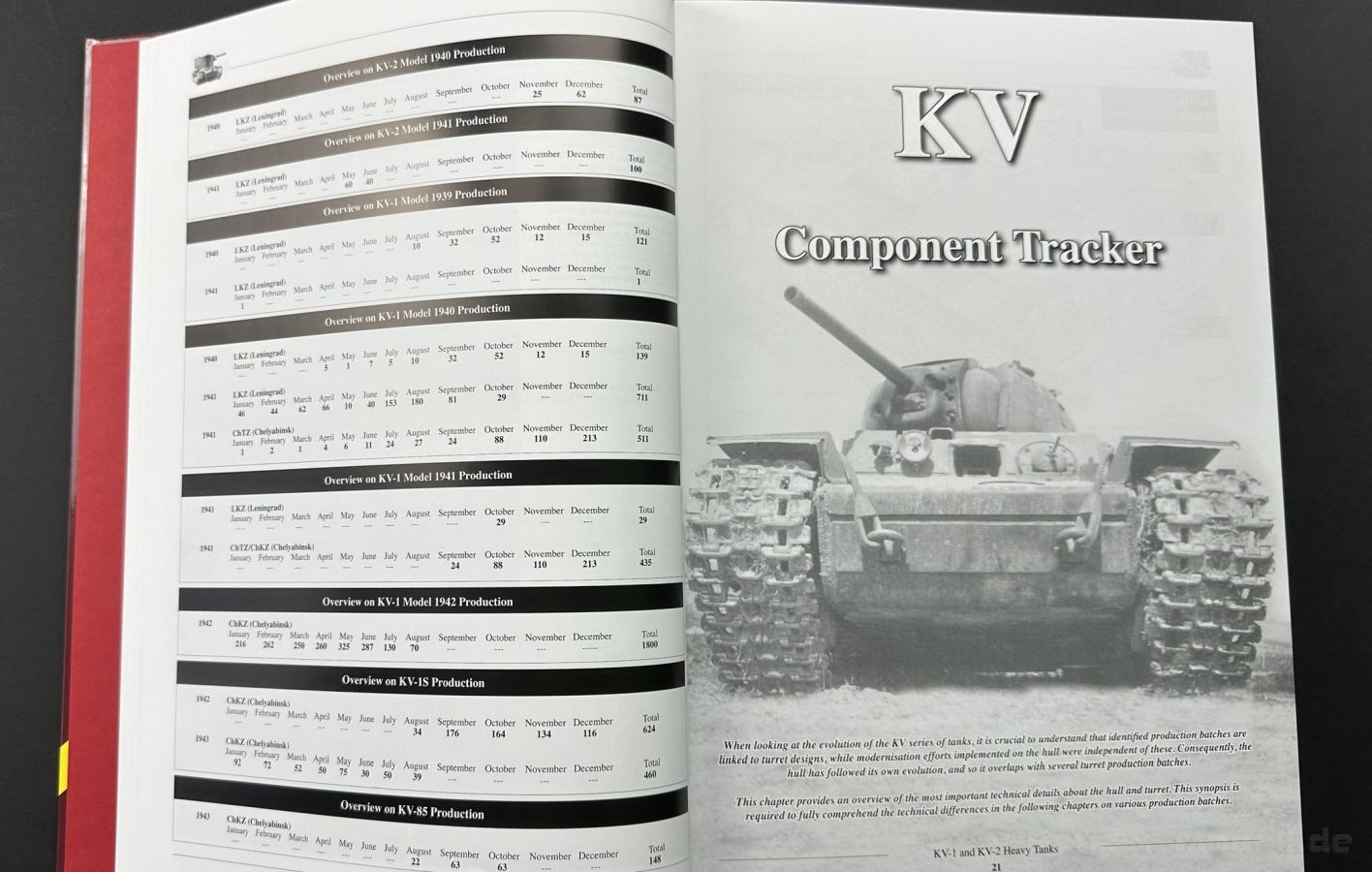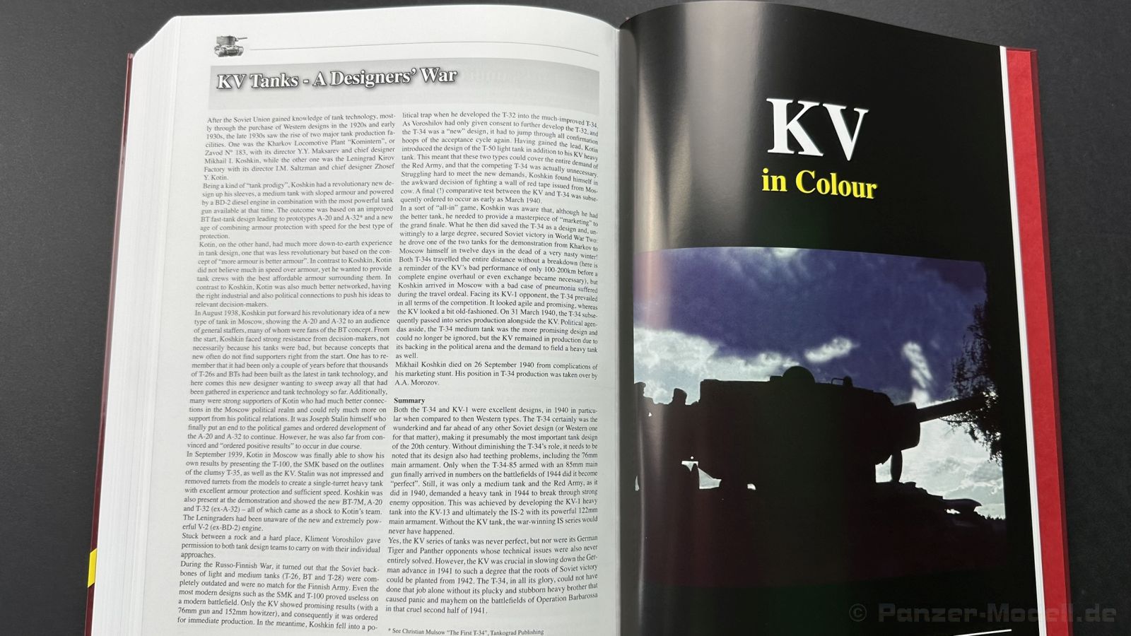 Hier habe ich das ultimative Nachschlagewerk zum Thema KV Panzer zur Vorstellung. Aber kommen wir zuerst zu den Eckdaten In dem Festeinband finden wir 728 Seiten, durchweg auf Hochglanzpapier mit 1030 Bildern, dazu kommen etliche Zeichnungen, Tabellen, einige Farbbilder und Colourprofile. Erwähnenswert ist dass die Zeichnungen in 1:35 angefertigt worden sind, das erleichtert dem geneigten Modellbauer doch erheblich seine Recherche bzw. Umbauten oder Korrekturen. Die Sprache ist leider ausnahmslos in Englisch gehalten, was dem begrenzten deutschen Markt zu Grunde zu führen ist. Wo wir bei begrenzt sind, schnell sein lohnt sich, das Buch ist auf 999 Exemplare limitiert, die Anzahl wird strikt von Herrn Vollert eingehalten. Das Buch gliedert sich wie folgt, nach der obligatorischen Danksagung folgen 3 Seiten, die den Inhalt umschreiben, das ist schon einmal eine Ansage! Es folgen insgesamt 25 Kapitel die Entstehungsgeschichte der KV-Serie wird eingehend beleuchtet sowie die einzelnen Typen, Prototypen, KV1 Model 1939,1940,1941, 1942, die KV2 Serie, KV-1S bis 85mm Version, Flammwerfer Varianten. Spezialaufbauten und natürlich deutsche Beutepanzer werden hier eingehend beleuchtet. Das Buch ist nicht nur für den Militärhistorisch Interessierten von Belang sondern gerade der Modellbauer wird hier mit Maßstäblichen Zeichnungen in 1:35 bedacht. Das hilft sein Modell den historisch korrekten Feinschliff zu verpassen. Der Beute Panzer Teil zieht sich durch diverse Kapitel, wirklich spanend beschrieben und startet mit der Sichtung durch dt. Truppen, die Bekämpfungsmöglichkeiten und natürlich die Erprobung in Deutschland sowie die Umbauten, die durch deutsche Truppen vorgenommen worden sind. Was mir bisher nicht bekannt war, dass es eine Reihe von Dummies gegeben hat, um Einheiten zu trainieren oder einfach um den Gegner zu verwirren. Abgerundet wird das Buch von vielen Colorprofiles aus der Feder von Felipe Rodna, neben russischen Tarnschemen, finden wir auch Tarnungen der Wehrmacht. Abschließend lässt sich sagen, aufgrund der immensen Datenlage, der meist scharfen Bilder, Tabellen, Profilen und der Aufarbeitung der einzelnen und jemals Entwickelten Varianten der KV-Reihe ist es DAS Buch zum Thema. Ich denke aufgrund der limitierten Auflage und des hohen Preises wird das Buch sicherlich noch an Wert gewinnen. Einziges, minimales Manko, in Deutsch wäre der Lesefluss doch ein wenig leichter gefallen