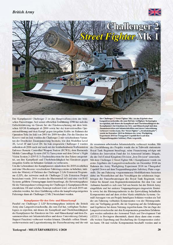 Aber auch der mehrseitige Bericht zum Challenger 2 Streetfighter ist hochinteressant - hier sieht man das Ergebnis einer Langzeitstudie mit neuen Technologien um den Challenger 2 für den Kampf im urbanen Gelände besser zu schützen und auszurüsten.