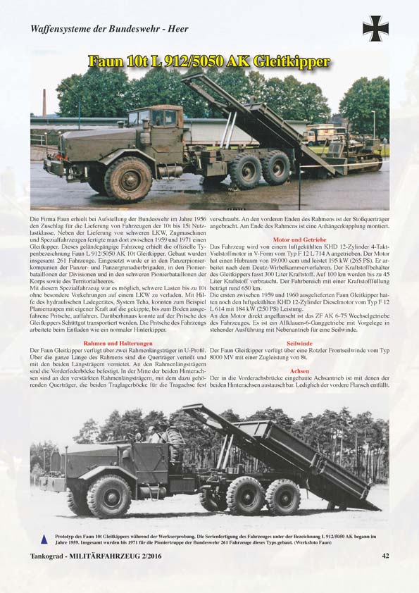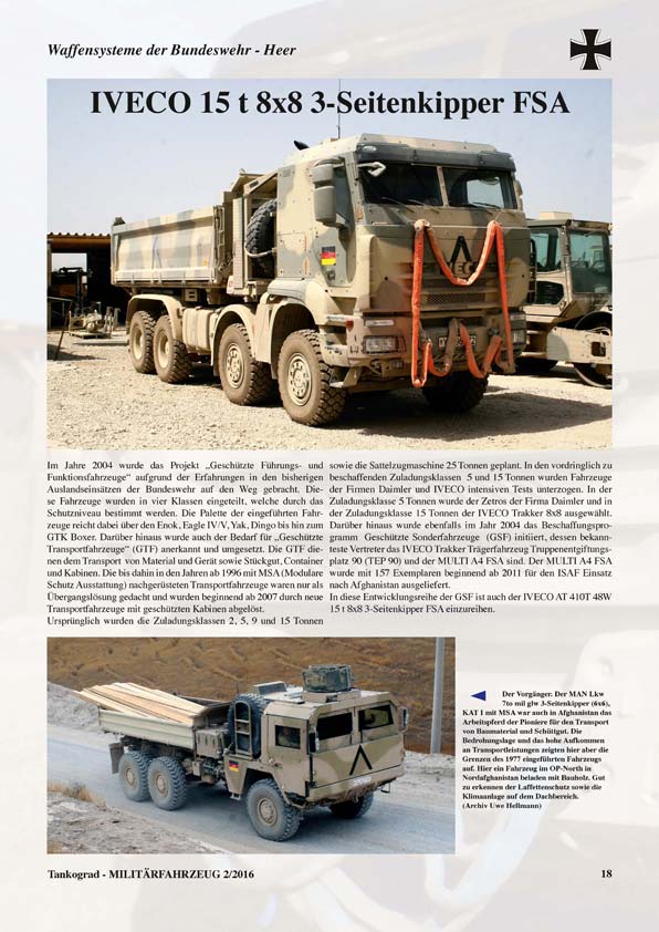 Die aktuelle Ausgabe des Militärfahrzeug zeigt mal wieder eine geballte Ladung Militärtechnik von gestern und heute. Im Einzelnen finden sich folgende Themenbereiche: Bundeswehr: Unser Heer 2016 Zunächst wird der aktuelle Fuhrpark / die Waffensysteme der Bundeswehr gezeigt. Interessant ist hierbei dass beim GTK Boxer, bei einem Gesamtbestand von 200 Fahrzeugen, nur 77 Fahrzeuge einsatzbereit sind und dass dieses Waffensystem zur Zeit als nicht einsatzreif eingestuft wird. Das sind gerade mal 64%, während vom guten alten Tpz Fuchs immerhin 80% der Fahrzeuge einsatzbereit sind. Weiter geht es dann mit der Übungsreihe Long Thrust ab dem Jahr 1961 der U.S. Streitkräfte. Thema ist hier die Truppenverstärkung am eisernen Vorhang und die Wegbereitung für die Übung BIG LIFT 63. Hierzu möchte ich auch auf das Heft Nr. 3025, Operation BIG LIFT 63, verweisen. Die Übung Long Thrust II fand im Januar 1962 auf dem Truppenübungsplatz Hohenfels statt. Tolle Fotos der verschneiten Übungslandschaft und ein sehr informativer Text machen diesen Bericht besonders interessant. Die Fans der Wehrmachtsfahrzeuge kommen ab Seite 16 mit dem Bericht zum Panzerwagen Skoda PA-II auf ihre Kosten. Auf den Seiten 32 bis 35 findet sich noch ein Bericht zum britischen Scammel Pioneer R100 Jumbo als Beutefahrzeug im Dienste der deutschen Wehrmacht. Ab Seite 18 wird der Iveco 15t 8x8 3-Seitenkipper FSA der Bundeswehr vorgestellt. Danach folgt ab Seite 24 ein Bericht zur Panzerbergung auf britische Art. Der CRARRV Rhino basiert auf dem Kampfpanzer Challenger 2 und ist das modernste Fahrzeug dieser Reihe. Gezeigt werden aber auch ältere Bergepanzer auf Basis des Chieftain. Fotos zeigen die Fahrzeuge im Ausbildungs- / Übungsbetrieb. Über die Möllerrödtage, das skandinavische Gegenstück zur War & Peace Show in England, wird auf Seite 31 berichtet. Für mich persönlich ganz besonders interessant ist der Bericht zum Leoparden Leasing. Die Royal Canadian Dragoons führen die Übung Naab Jubilee II im Jahr 1977 mit gemieteten Leopard 1A2 auf dem Truppenübungsplatz Hohenfels durch. Ein sehr schönes Farbfoto zeigt zum Beispiel zwei Bäuerinnen bei der Kartoffelernte unter dem „Schutz“ eines kanadischen Leoparden mit einer Tarnung aus Schlamm und Zweigen. Ein rundum gelungenes Heft mit sehr interessanten Berichten. Anzahl Fotos und Illustrationen: Format A4, durchgehend bebildert. Quartalszeitschrift. Text Sprache: Kompletter deutscher Text Seitenanzahl: 56+4 Das Heft kann zum Preis von 8,95 € direkt über den Verlag bezogen werden.