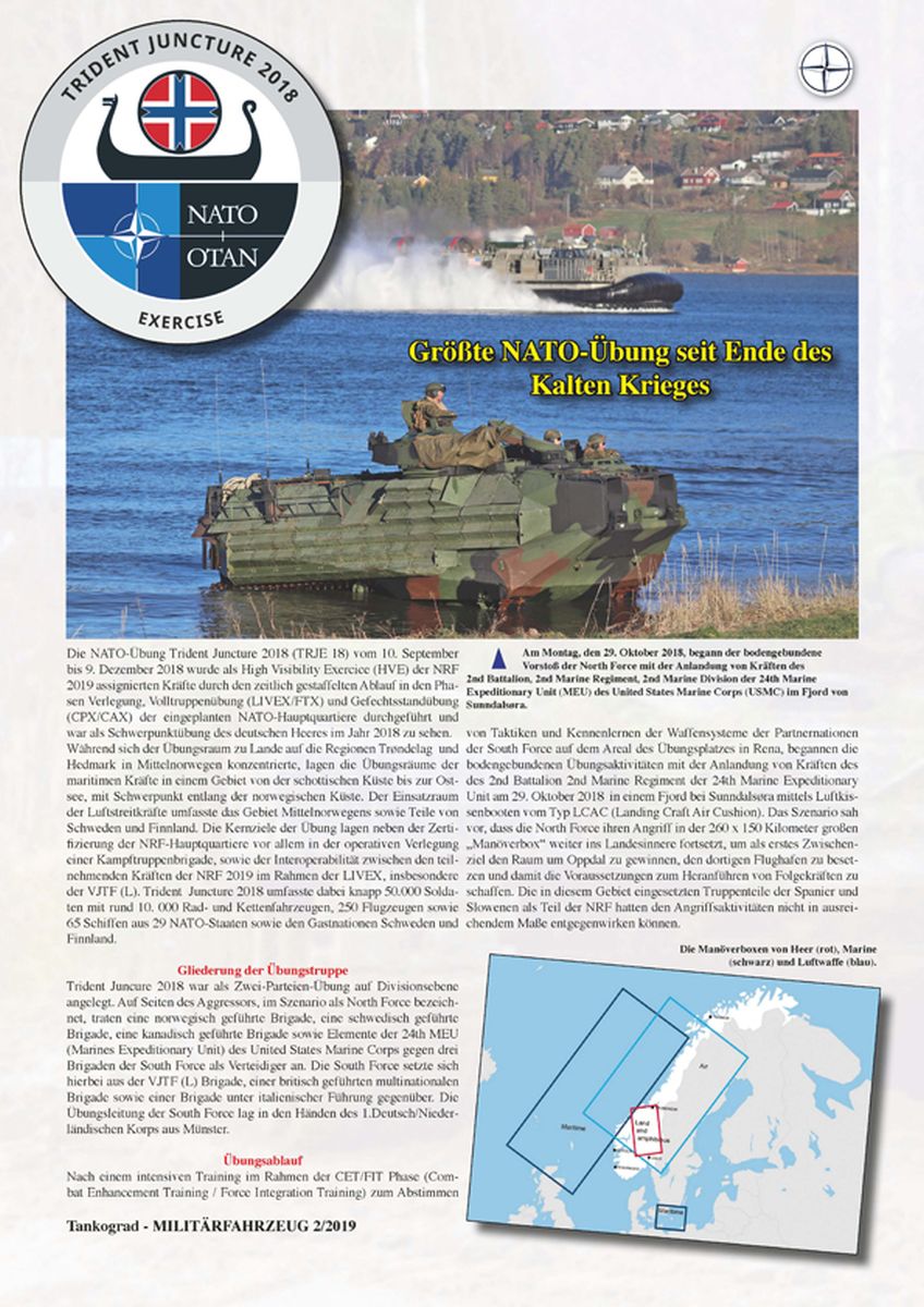 Zu Beginn finden wir Infos zu Lieferungen der UTF-Logistik Lkws und Elefant 2 an die Bundeswehr und Leopard 2A7+ für Ungarn. Der Bradley mit TROPHY wird kurz angesprochen, ebenso das Thema Militärparaden und wir erfahren, wo Tankograd Bilder Scale Model World 2018 bereithält. Trident Juncture 2018 berichtet mit einigen Bildern der verwendeten Fahrzeuge von der größten NATO-Übung seit dem Ende des kalten Krieges. Wie wir es von den ganzbändigen Ausgaben Missions & Manoeuvres kennen, erwarten uns in Kurzform eine Beschreibung der Übung, Aufstellung der Einheiten und weitere Informationen. Als Soldat der 80-er muss ich mich immer wieder neu daran gewöhnen, zwischen Bildern von Fahrzeugen der westlichen Produktion auch solche aus dem „Ostblock“ in NATO-Farben zu finden.KÄFER "Nachbrenner" und läuft und läuft und läuft. Wusstet Ihr schon, dass der Käfer auch bei… ... im Einsatz war? Mehr wird nicht verraten! Info und Fotos findet Ihr im Heft. Modellbauer, die grad einen der neuen Jagdpanther Bausätze auf dem Basteltisch haben, werden sich über den Artikel der JAGDPANTHER Restaurierung mit vielen Innen- und Außenansichten während der Restauration und nach der Fertigstellung freuen. Dem Thema wurden allein 9 Seiten gegönnt. Wer in der Welt unterwegs ist und mal wieder ein militärgeschichtliches Museum besuchen möchte, erfährt im Themenbereich Museen-Events-Sammlerszene etwas zum Iowa Gold Star Museum, dem Museé Guerre & Paix en Ardennes und dem Heeresgeschichtlichen Museum Wien. Was gibt es zu sehen (und was eventuell nicht) und wie sind die Verhältnisse vor Ort. Dem M1296 Stryker DRAGOON sind 6 Seiten gewidmet. Unterstützt von erstklassigen Aufnahmen wird die Entwicklung, tatsächliche Produktion, Kampfwertsteigerung, Bewaffnung und Einsatz beschrieben. Dem modernen Dragoon folgt ein wahrer Oldtimer der kaiserlich-deutschen Armee im 1. Weltkrieg - AUTOCANNONE 102/35 SPA 9000C - ein urig aussehendes Fahrzeug mit einer grossen “Wumme“. Wie Trident Juncture 2018 beschäftigt sich Hedgehog / Siil 2018 mit einem weiteren NATO-Manöver. Auch hier eine bunte Mischung an Fotos von teilnehmenden Fahrzeugen. Da geht es tierisch zu, denn Wiesel, Fuchs und auch ein Iltis geben sich ein Stelldichein wie auch Warrior und CV9035 oder auch ein 7t gl MAN KAT1 mit leichter Flak auf der Ladefläche. Zum Thema Bundeswehr gibt es die Artikel Gründerjahre und 5-Tonner LKW-Legende "EMMA". Gründerjahre versorgt uns mit Fotos von Material der ersten Stunde der Bundeswehr. Und die alten BW-Lkw-Fahrer werden sich über die Bilder zu ihrer EMMA freuen. Pritsche, Koffer, Kipper, Zugmaschine was EMMA eben so draufhatte. eFP Battle Group Estonia befasst sich mit einer multinationalen Truppe, eingesetzt in den baltischen Staaten und Polen. Der Kern der Truppe wurde 2018 durch die britische Armee gestellt, daher finden wir den Bericht unter „British Army“. Schöne Aufnahmen der Challengers, Warriors, FV 432 und anderen untermalen die Informationen. Wie schon gesagt für jeden ist etwas dabei. Die gezeigten Aufnahmen sind wie gewohnt von sehr hoher Qualität.