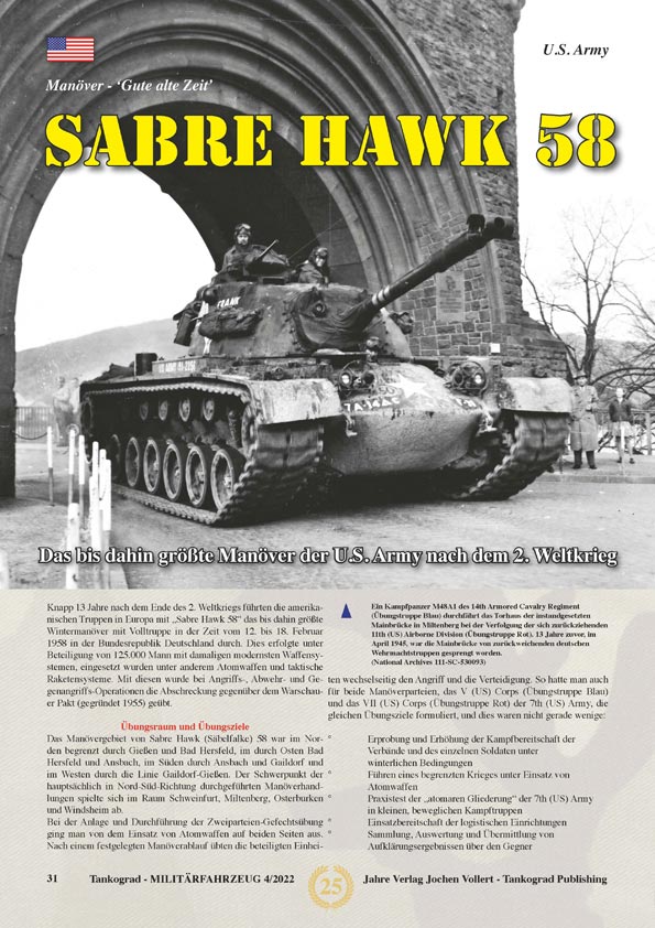 In dieser Ausgabe der Militärfahrzeug, die das 25 jährige Jubiläum des Tankograd Verlags markiert, finden wir wieder eine interessante Zusammenstellung an Themen mit guten Berichten und entsprechenden Fotos. Quer durch alle Militärfahrzeugbereiche ist für jeden etwas dabei.