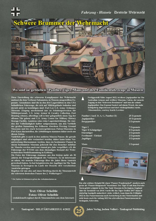Umfangreicher und fokussiert auf die schweren Kampfpanzer der Wehrmacht, ist die bebilderte Übersicht über die überlebenden Fahrzeuge an Panthern, Tigern und deren Abarten und wo diese in welchem Museum zu finden sind ... ideal für die nächste Urlaubsplanung.