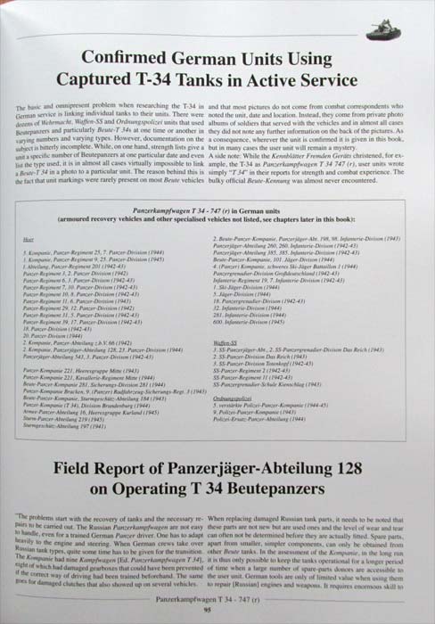 Bevor es dann richtig zur Sache geht mit den erbeuteten T-34 in deutschen Diensten gibt es noch eine 3seitige Einführung mit Listen der Einheiten, die T-34 nutzten, die Wehrmachts T-34 Identifikation und ein Erfahrungsbericht der PzJgAbt.128 mit T-34 im Einsatz.