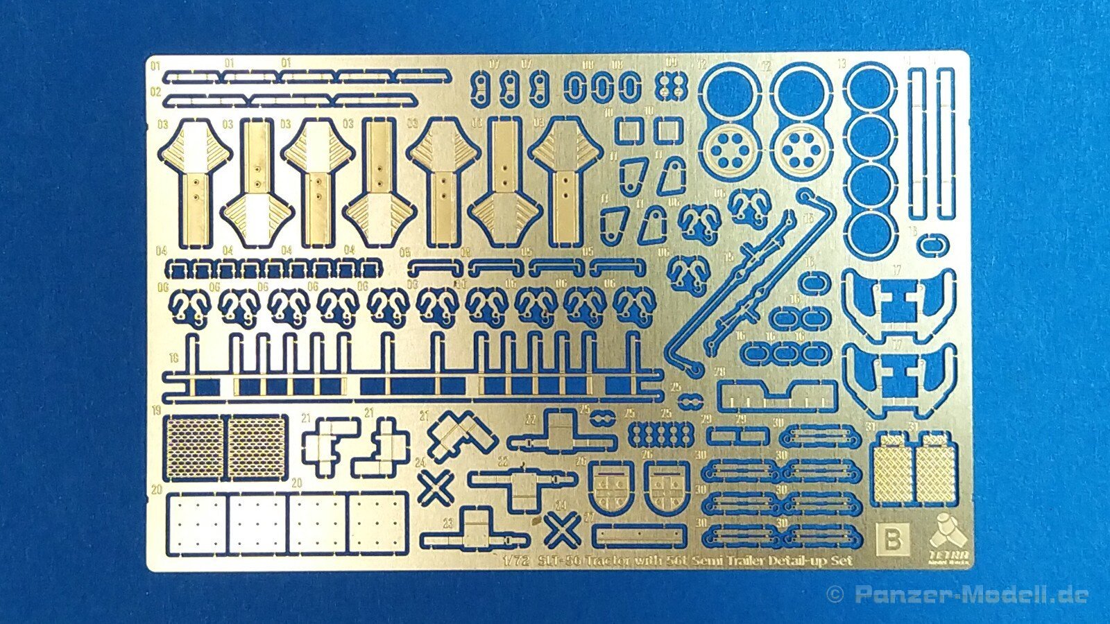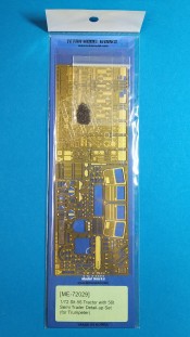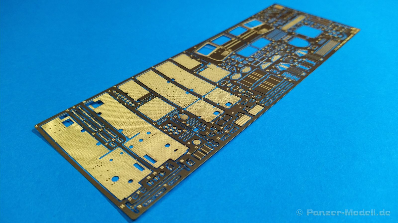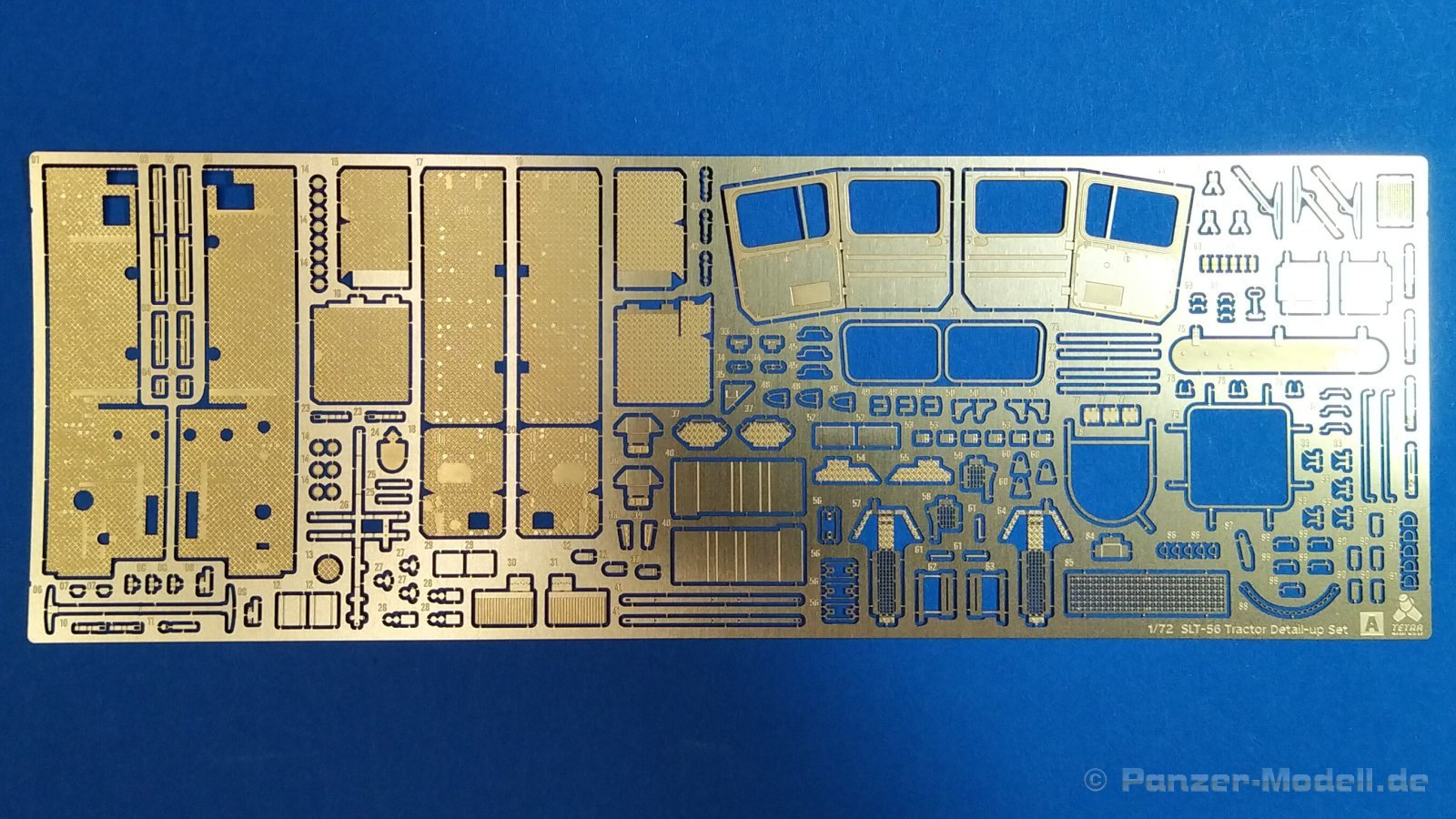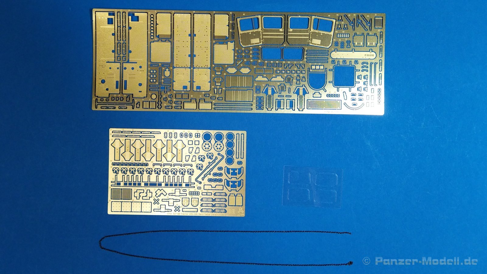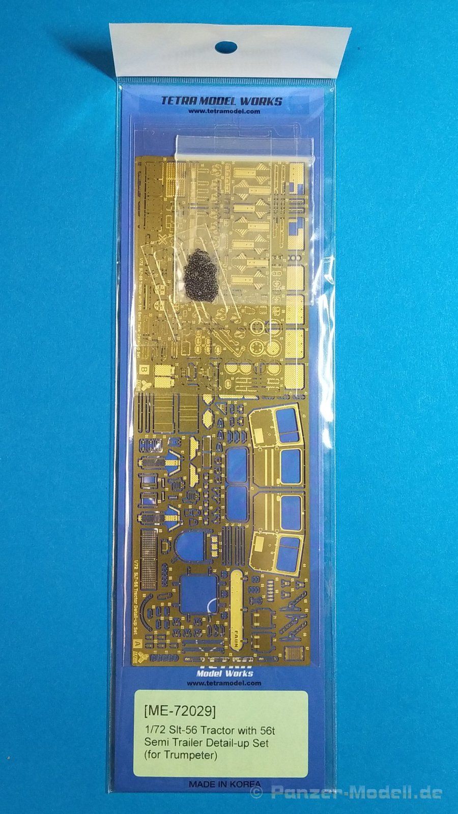 Tetra Model Works ist ein koreanischer Hersteller und bekannt für hochqualitative Fotoätzteile und Zubehör in verschiedenen Maßstäben. Im Maßstab 1:72 ist unter der Nr. ME-72029 ein Detailierungssatz für den Trumpeter Bausatz Nr. 07196 des Bundeswehr Panzertransporter Faun SLT-56 „Franziska“ erschienen. In einer pappverstärkten Klarsichtverpackung wird folgender Inhalt geliefert: - 1 zweiseitige farbige Bauanleitung (ca. DIN A3) - 1 Fotoätzplatine „groß“ (185 x 64mm) mit diversen Bauteilen - 1 Fotoätzplatine „klein“ (87 x 55mm) mit diversen Bauteilen - 1 Klarsichtbogen (45 x 15mm) mit 4 vorgestanzten Türfenstern - 1 Kette brüniert Die beiden enthaltenen Fotoätzplatinen weisen viele sinnvolle Bauteile auf. Alle Fotoätzteile sind durch die Bank gut durchdacht und fein ausgeführt. Beide Platinenstärken sind nicht zu dünn oder zu dick. Ich würde sie als maßstäblich passend bezeichnen. Auf der großen Platine lassen sich unter anderem Türen der Fahrerkabine finden, um diese geöffnet darstellen zu können. Dazu weisen diese durch einen mehrlagigen Aufbau auch eine Innendetaillierung auf. Einen weiteren großen Bereich nehmen die Kotflügel bzw. Trittbleche auf der Platine ein. Hier gilt es die Plastikteile des Bausatzes durch beiliegende fein gearbeitete Riffelbleche auszutauschen. Die Struktur wurde stimmig umgesetzt und weiß sehr zu gefallen. Viele weitere Teile wie durchbrochene Auftritte, Lufteinlässe, feine Haken, Scheibenwischer etc. sorgen für ein Plus an Detailierung an dem Plastikbausatz. Auch an Unterlegkeile oder das bundewehrtypische Leitkreuz wurde u. a. auf der kleinen Platine gedacht. Für die Türenfenster liegt ein dünner klarer Bogen Plastikmaterial mit bereits vorgestanzten Fensterteilen dem Detaillierungsset bei. Bei so einem Fahrzeug ist die Verzurrung des Transportgutes ein entscheidendes Detail. Dazu liegt dem Zurüstsatz ein Stück brünierte Kette bei, das in Kombination mit fotogeätzten Haken ein sehr filigranes Bauteil darstellt. Die annähernd DIN A3 große beiliegende Bauanleitung zeigt sehr gut auf Vorder- und Rückseite anhand von Zeichnungen und Fotos des fertigen Modells die Anbringung der enthaltenen Teile. Dabei wird deutlich durch roteingefärbte Bereiche auf abzutrennende Bauteile des Grundbausatzes hingewiesen, die durch detaillierte Fotoätzteile ersetzt werden müssen. Auch die einzelnen Arbeitsschritte zum Biegen der Teile werde durch Piktogramme verständlich erläutert. Mein Fazit: Dank Tetra Model Works kann man mit diesem Zurüstsatz noch mehr an Detailierung aus dem Trumpeter-Bausatz herausholen. Eine wirklich sinnvolle Zusammenstellung an verschiedenen Teilen wird uns hier präsentiert. Die enthaltenen Teile sind fein umgesetzt und wirklich gut durchdacht. Der Anfänger wird sicherlich vor dieser Art von umfangreichem Fotoätzteilbogen zurückschrecken. Das Set richtet sich daher eher an erfahrene Modellbauer mit entsprechendem Werkzeug. Der Preis für die Detaillierung und Qualität ist absolut ok und machen ihn für Freunde moderner Bundeswehrfahrzeuge daher zu einer absoluten Kaufempfehlung!