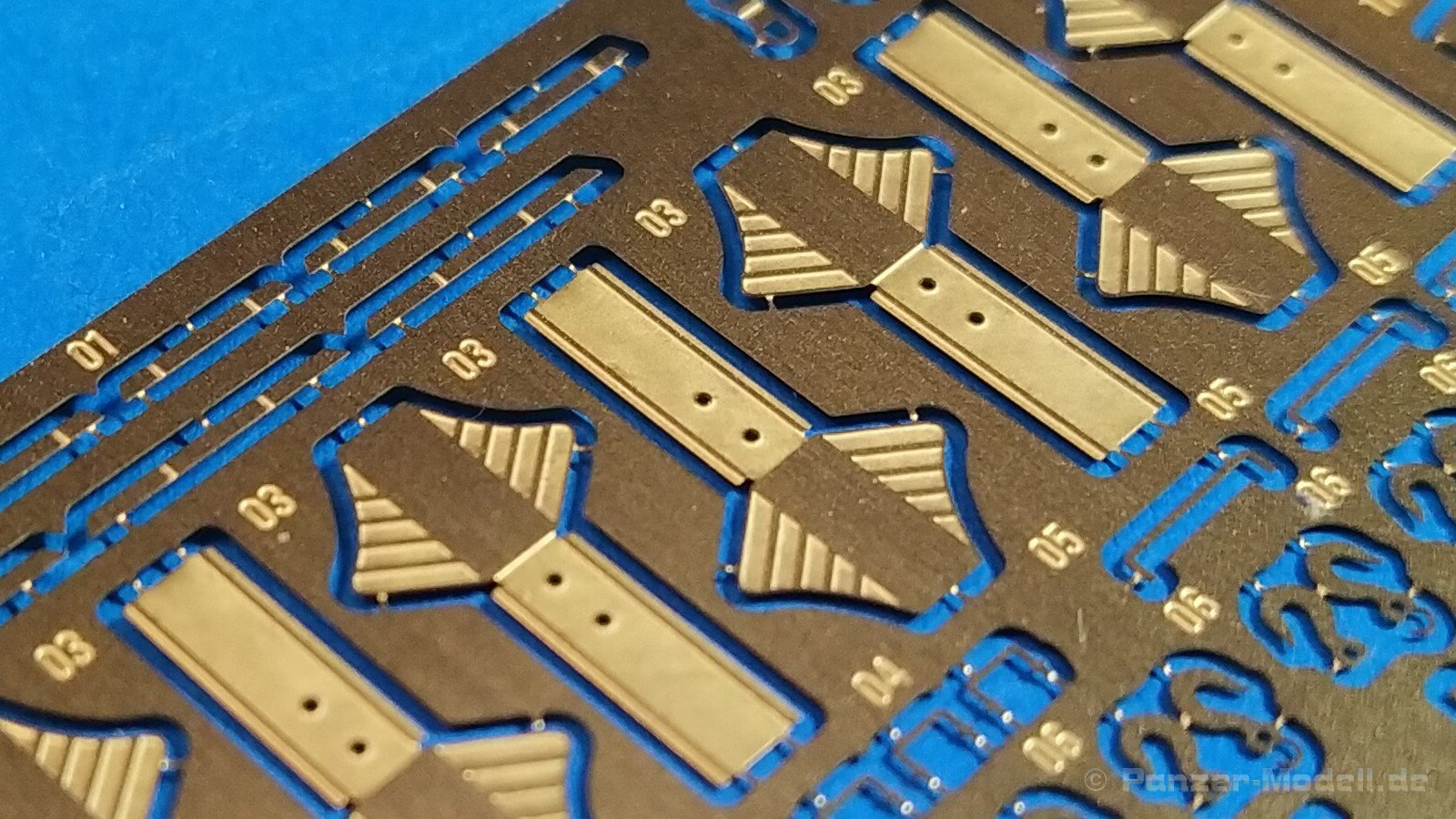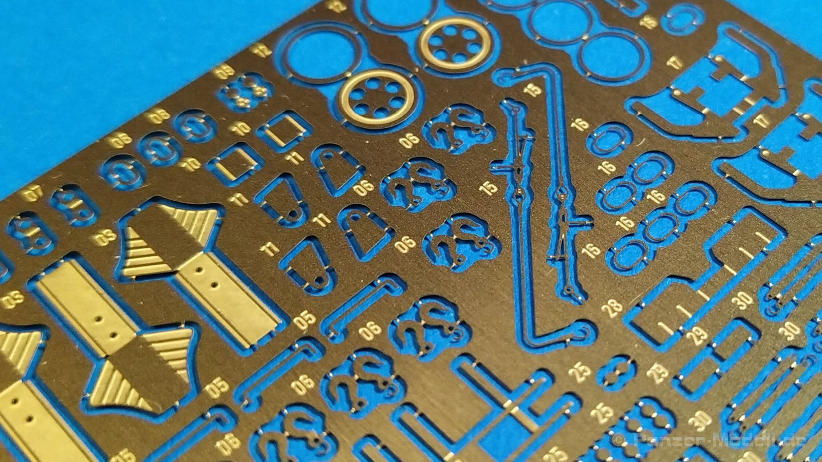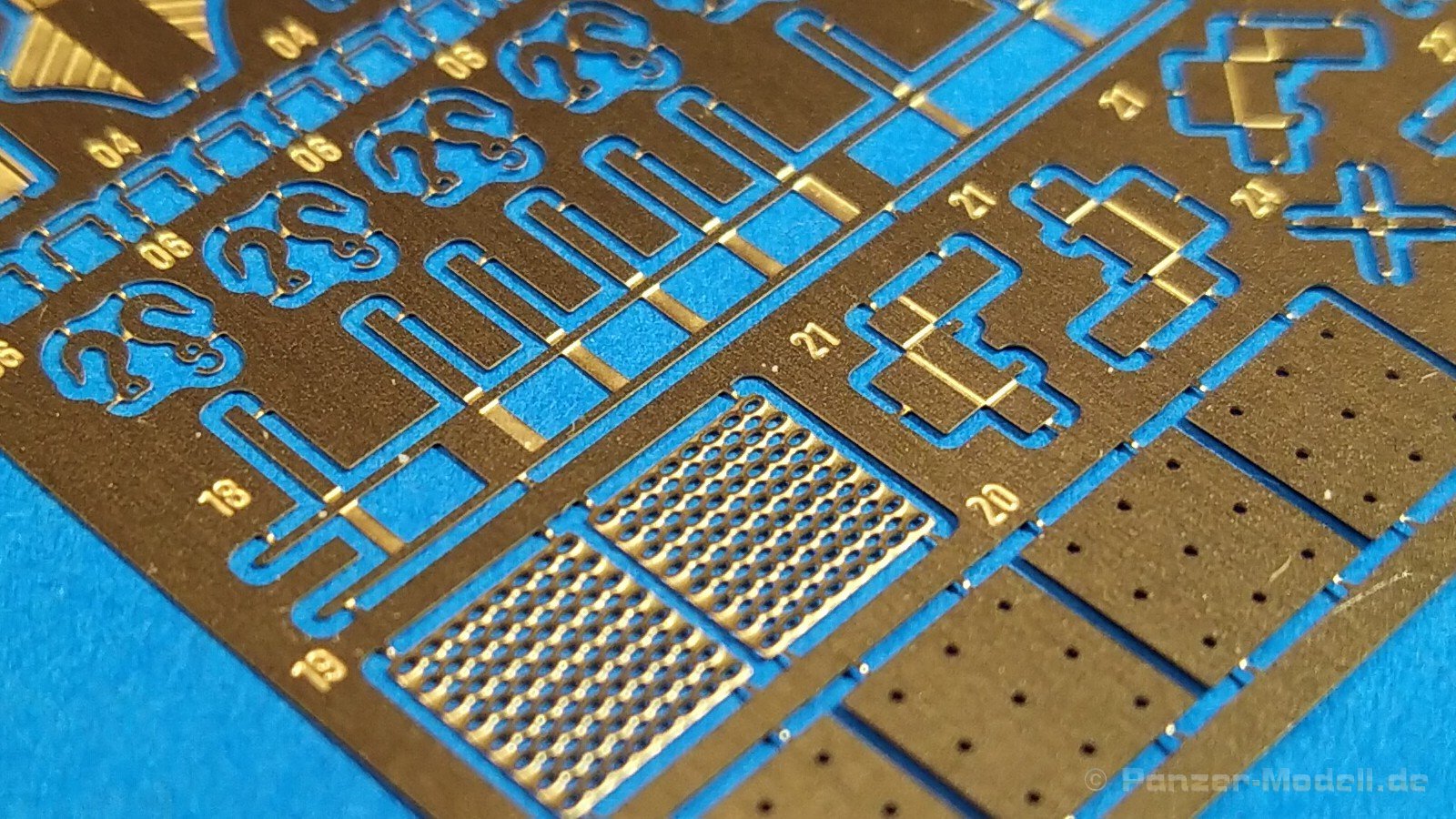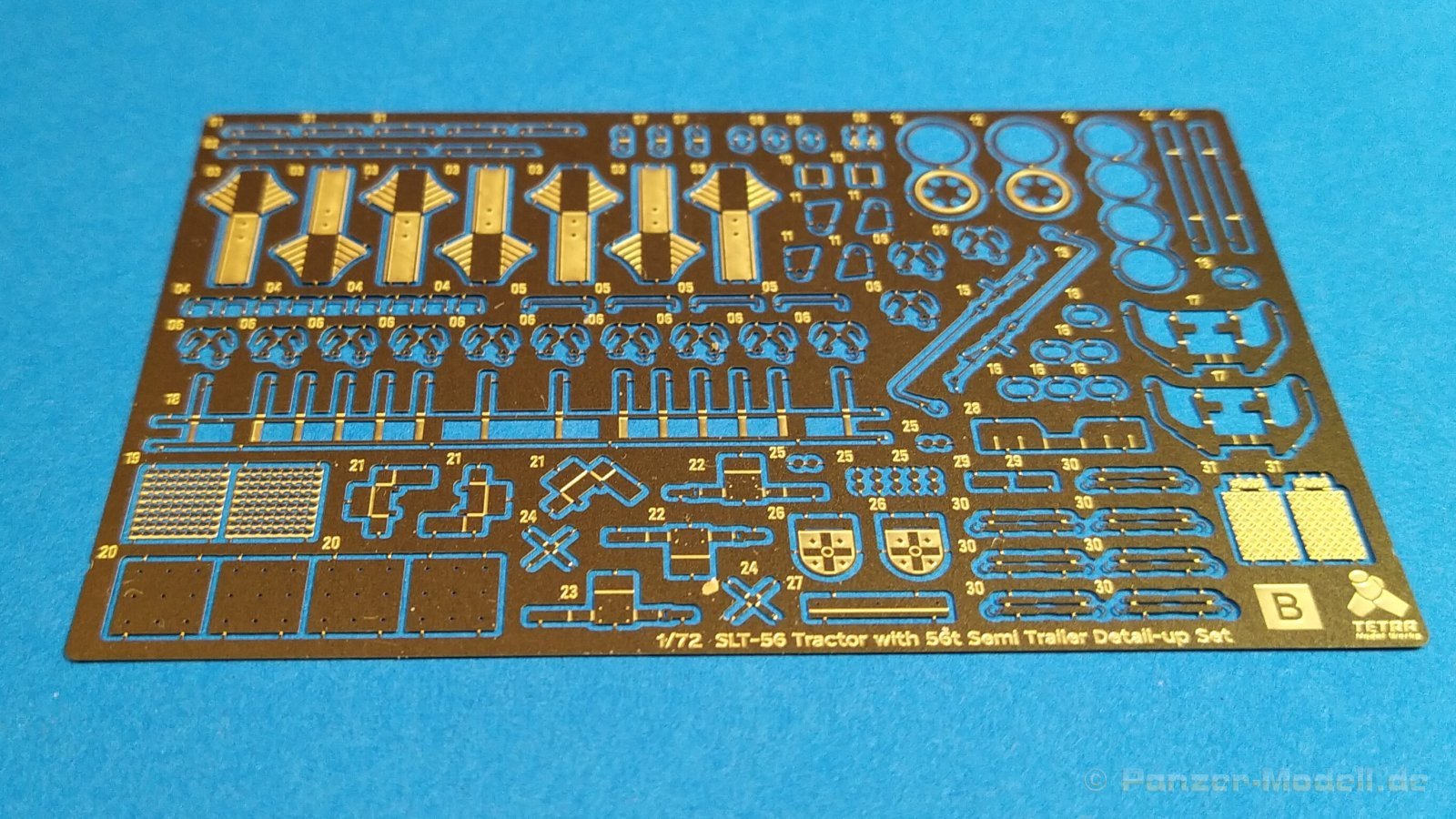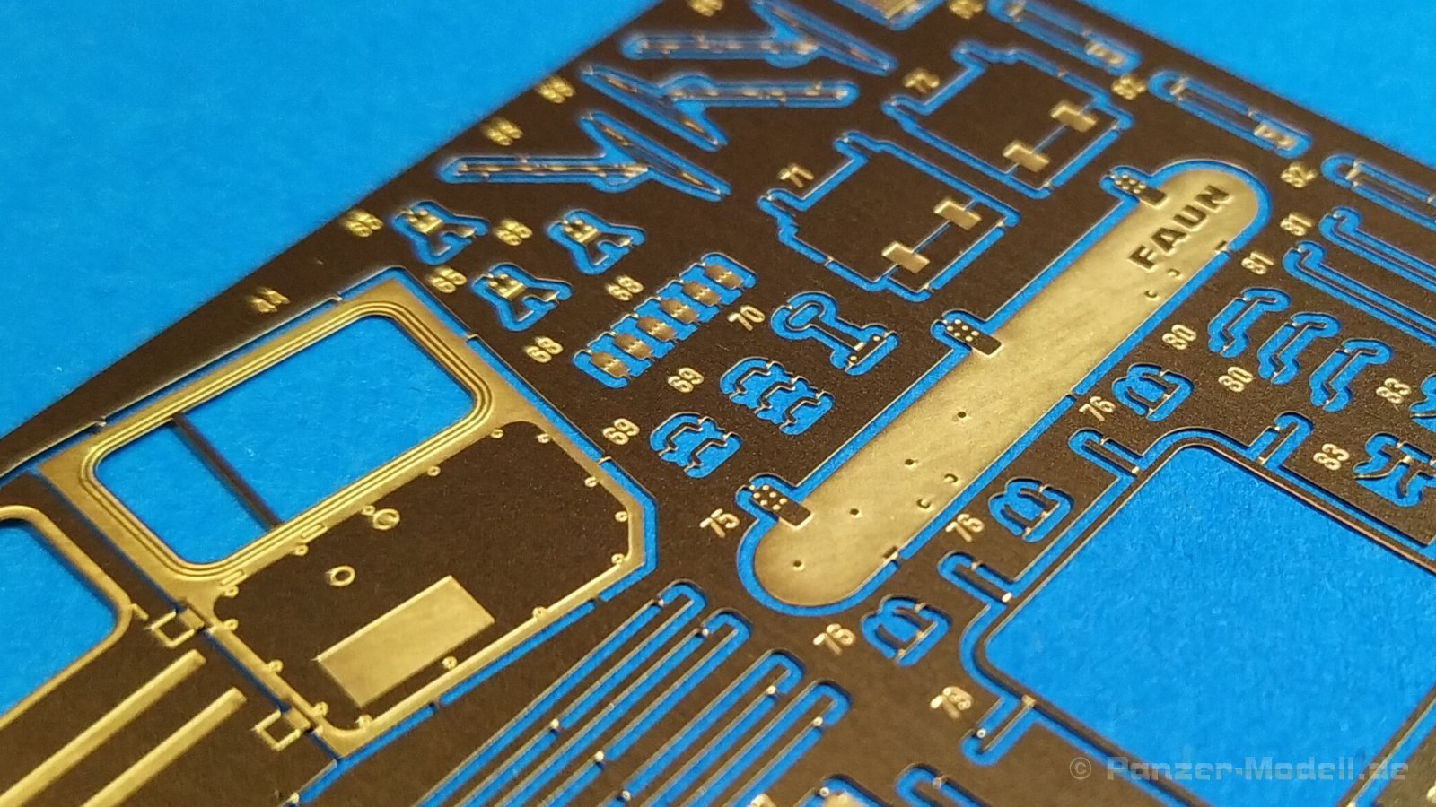 Tetra Model Works ist ein koreanischer Hersteller und bekannt für hochqualitative Fotoätzteile und Zubehör in verschiedenen Maßstäben. Im Maßstab 1:72 ist unter der Nr. ME-72029 ein Detailierungssatz für den Trumpeter Bausatz Nr. 07196 des Bundeswehr Panzertransporter Faun SLT-56 „Franziska“ erschienen. In einer pappverstärkten Klarsichtverpackung wird folgender Inhalt geliefert: - 1 zweiseitige farbige Bauanleitung (ca. DIN A3) - 1 Fotoätzplatine „groß“ (185 x 64mm) mit diversen Bauteilen - 1 Fotoätzplatine „klein“ (87 x 55mm) mit diversen Bauteilen - 1 Klarsichtbogen (45 x 15mm) mit 4 vorgestanzten Türfenstern - 1 Kette brüniert Die beiden enthaltenen Fotoätzplatinen weisen viele sinnvolle Bauteile auf. Alle Fotoätzteile sind durch die Bank gut durchdacht und fein ausgeführt. Beide Platinenstärken sind nicht zu dünn oder zu dick. Ich würde sie als maßstäblich passend bezeichnen. Auf der großen Platine lassen sich unter anderem Türen der Fahrerkabine finden, um diese geöffnet darstellen zu können. Dazu weisen diese durch einen mehrlagigen Aufbau auch eine Innendetaillierung auf. Einen weiteren großen Bereich nehmen die Kotflügel bzw. Trittbleche auf der Platine ein. Hier gilt es die Plastikteile des Bausatzes durch beiliegende fein gearbeitete Riffelbleche auszutauschen. Die Struktur wurde stimmig umgesetzt und weiß sehr zu gefallen. Viele weitere Teile wie durchbrochene Auftritte, Lufteinlässe, feine Haken, Scheibenwischer etc. sorgen für ein Plus an Detailierung an dem Plastikbausatz. Auch an Unterlegkeile oder das bundewehrtypische Leitkreuz wurde u. a. auf der kleinen Platine gedacht. Für die Türenfenster liegt ein dünner klarer Bogen Plastikmaterial mit bereits vorgestanzten Fensterteilen dem Detaillierungsset bei. Bei so einem Fahrzeug ist die Verzurrung des Transportgutes ein entscheidendes Detail. Dazu liegt dem Zurüstsatz ein Stück brünierte Kette bei, das in Kombination mit fotogeätzten Haken ein sehr filigranes Bauteil darstellt. Die annähernd DIN A3 große beiliegende Bauanleitung zeigt sehr gut auf Vorder- und Rückseite anhand von Zeichnungen und Fotos des fertigen Modells die Anbringung der enthaltenen Teile. Dabei wird deutlich durch roteingefärbte Bereiche auf abzutrennende Bauteile des Grundbausatzes hingewiesen, die durch detaillierte Fotoätzteile ersetzt werden müssen. Auch die einzelnen Arbeitsschritte zum Biegen der Teile werde durch Piktogramme verständlich erläutert. Mein Fazit: Dank Tetra Model Works kann man mit diesem Zurüstsatz noch mehr an Detailierung aus dem Trumpeter-Bausatz herausholen. Eine wirklich sinnvolle Zusammenstellung an verschiedenen Teilen wird uns hier präsentiert. Die enthaltenen Teile sind fein umgesetzt und wirklich gut durchdacht. Der Anfänger wird sicherlich vor dieser Art von umfangreichem Fotoätzteilbogen zurückschrecken. Das Set richtet sich daher eher an erfahrene Modellbauer mit entsprechendem Werkzeug. Der Preis für die Detaillierung und Qualität ist absolut ok und machen ihn für Freunde moderner Bundeswehrfahrzeuge daher zu einer absoluten Kaufempfehlung!