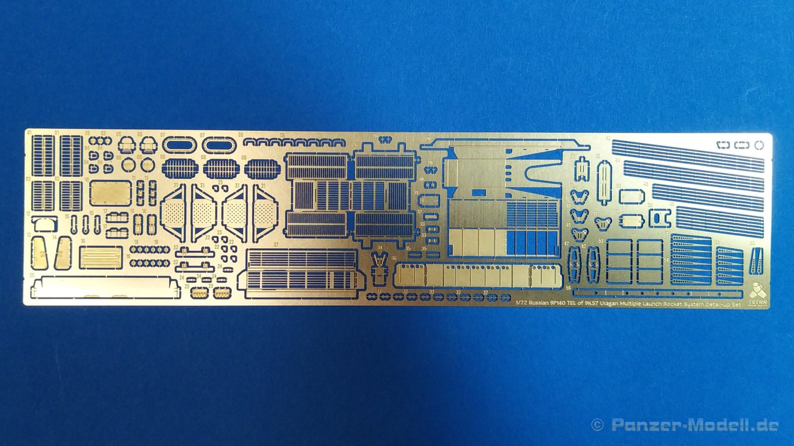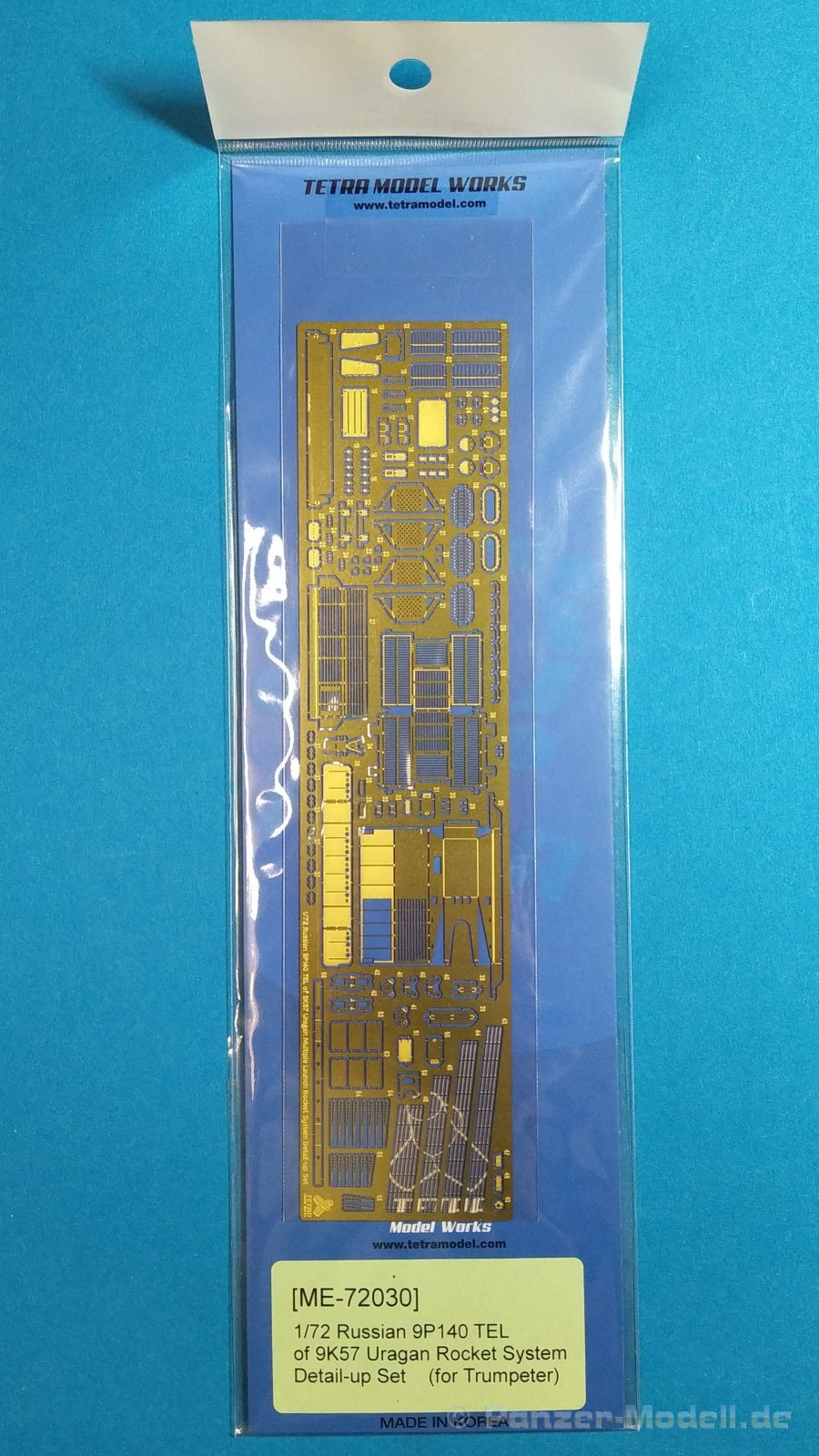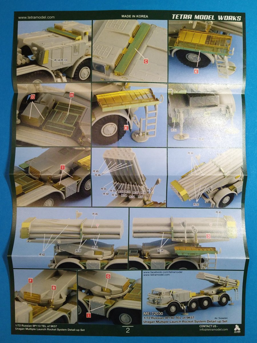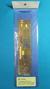 Der koreanische Hersteller Tetra Model Works hat im Maßstab 1:72 unter der Nr. ME-72030 ein Detailierungssatz für den Trumpeter Bausatz Nr. 07180 des russischen Raketenwerfers 9P140 TEL des 9K57 Uragan Raketensystems herausgebracht. In einer pappverstärkten Klarsichtverpackung wird folgender Inhalt geliefert: - 1 zweiseitige farbige Bauanleitung (ca. DIN A4) - 1 Fotoätzplatine (180 x 42mm) mit diversen Bauteilen Auf der enthaltenen Fotoätzplatine finden sich viele sinnvolle Bauteile. Die Bauteile sind durch die Bank gut durchdacht und fein ausgeführt. Die Platinenstärke würde ich als maßstäblich passend bezeichnen. Sie ist nicht zu dünn oder zu dick. Einen großen Teil auf der Platine nimmt u.a. die Arbeitsplattform des Richtkanoniers ein. Einen weiteren großen Bereich nehmen die verschiedenen Verstrebungen an der Werferanlage ein. Hier gibt es einzelne Bandstahlteile und auch Lochbleche. Trittbleche mit Riffelmuster, Klappen, Abdeckungen, etc. sind weitere Bauteile auf der Platine. Hier gilt es die Plastikteile des Bausatzes durch beiliegende fein gearbeitete Bleche auszutauschen. Die Struktur wurde stimmig umgesetzt und weiß sehr zu gefallen. Viele weitere Teile wie durchbrochene Auftritte, Lufteinlässe, feine Haken, etc. sorgen für ein Plus an Detailierung an dem Plastikbausatz. Die annähernd DIN A4 große beiliegende Bauanleitung zeigt sehr gut auf Vorder- und Rückseite anhand von Zeichnungen und Fotos des fertigen Modells die Anbringung der enthaltenen Teile. Dabei wird deutlich durch roteingefärbte Bereiche auf abzutrennende Bauteile des Grundbausatzes hingewiesen, die durch detaillierte Fotoätzteile ersetzt werden müssen. Auch die einzelnen Arbeitsschritte zum Biegen der Teile werde durch Piktogramme verständlich erläutert. Mein Fazit: Auch mit diesem Zurüstsatz schafft es Tetra Model Works noch mehr an Detailierung aus dem Grundbausatz von Trumpeter herausholen. Die Zusammenstellung der verschiedenen Fotoätzteile ist wirklich sinnvoll. Die enthaltenen Teile sind fein umgesetzt und wirklich gut durchdacht. Nicht für den Anfänger geeignet richtet sich das Set sicherlich eher an erfahrene Modellbauer mit entsprechendem Werkzeug. Der Preis für die Detaillierung und Qualität ist absolut ok und machen ihn für Freunde russischer Militärtechnik daher zu einer absoluten Kaufempfehlung!