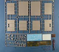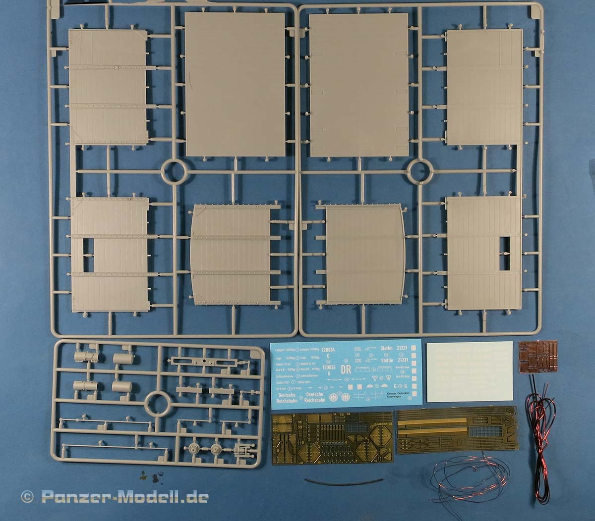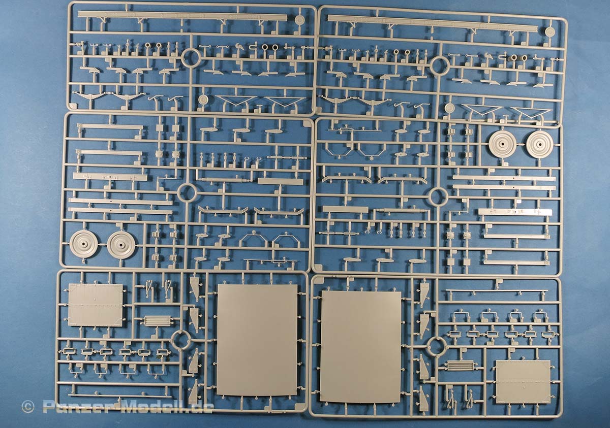 Im Karton finden sich 9 graue Spritzlinge, 3 PE Platinen, Plastikschlauchmaterial, Kupferdraht in zwei Stärken und zwei Decalbögen.