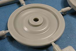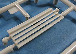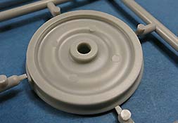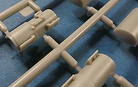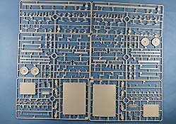 Der Tragrahmen setzt sich aus recht vielen Holmen und Einzelteilen zusammen. Die beiden Achsen werden drehbar in die Halterungen eingebaut und bestehen aus der Achse an sich an deren Enden die Räder angebaut werden. Diese sehen soweit gut aus, gerade die mehrfache Wölbungen auf beiden Seiten. Leider haben sich gerade an der Aussenseite Auswerferstellen eingefunden, die schwierig zu versäubern sein dürften.
