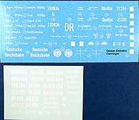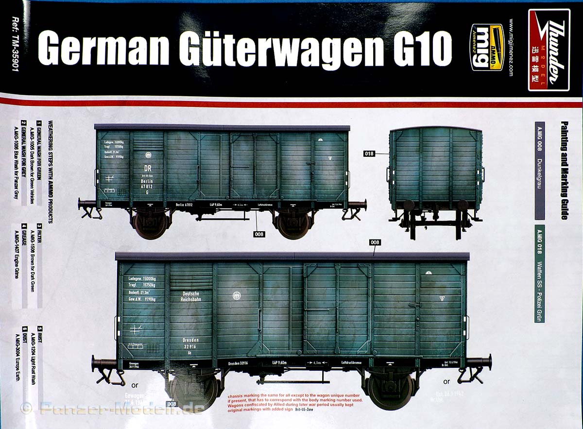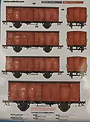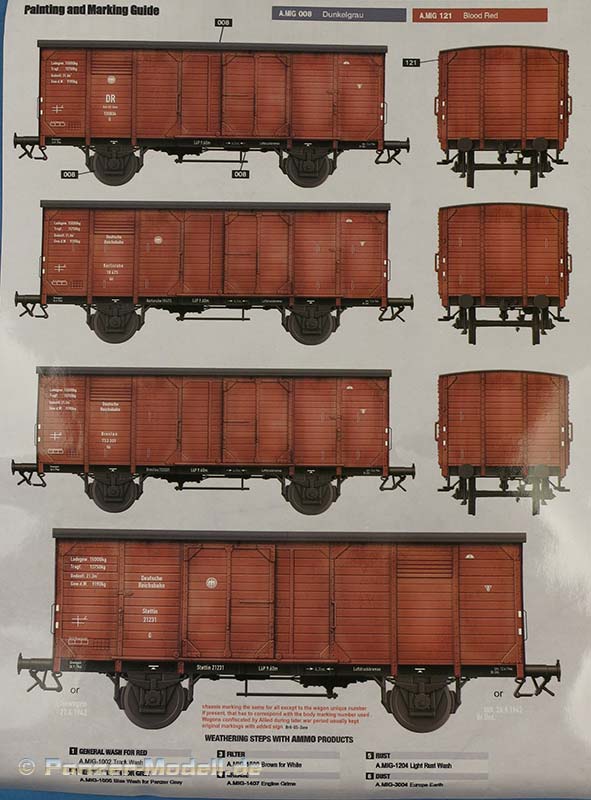 Auf einem extra beiliegenden doppelseitig farbig gedruckten Hochglanz DIN A4 Bogen sind eine Dreiseitenansicht mit grundsätzlichen Markierungen des Waggons bei der Reichsbahn und auf der Rückseite vier Seitenansichten mit weiteren Markierungen. Die Farbangaben sind für Farben von Ammo by Mig. Die Decalbögen geben reichlich Optionsmöglichkeiten