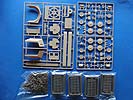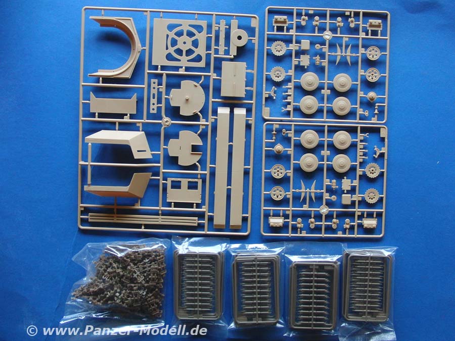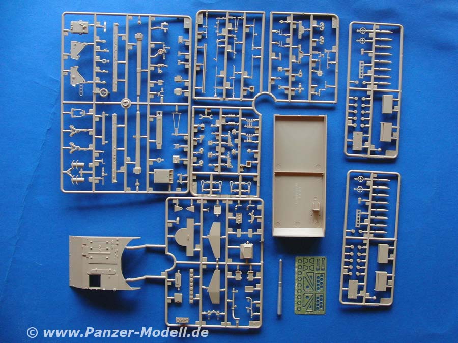 Im Karton finden sich über 920 Teile an 8 Spritzlingen, Unterwanne, PE Teile, Alurohr, eine Einzelgliedkette und ein Decalbogen.