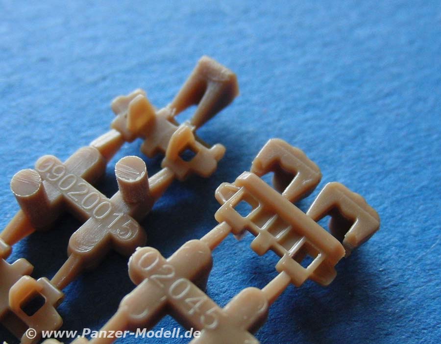 Der absolute Clou des Bausatzes aber dürfte die Einzelgliedkette sein. Diese kommt mit je zwei Einzelgliedern an einem Spritzlingsast plus je zwei kleine Steckstifte daher - und bleibt bei entsprechend sorgsamen Zusammenbau BEWEGLICH! Das ist schon recht sensationell. ob das nun unbedingt notwändig ist, lasse ich mal dahingestellt. tatsache ist, dass der Bau recht aufwändig werden dürfte. Es liegt eine kleine Montagehilfe bei, auf der die Kettenglieder aufgelegt werden und dann mit den beiden stiften miteinander verbunden werden. dabei unterscheiden sich die beiden stifte auch noch sodass man diese nicht vertauschen darf und so eine linke und rechte Kette produziert.