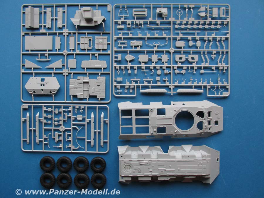 Im Karton finden sich 20 Spritzlinge, ein Spritzling in klarem Plastik, Oberwanne, Unterwanne, 8 Vinylreifen, 2 PE Platinen, Polycaps, Draht und ein Decalbogen.