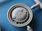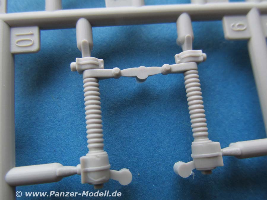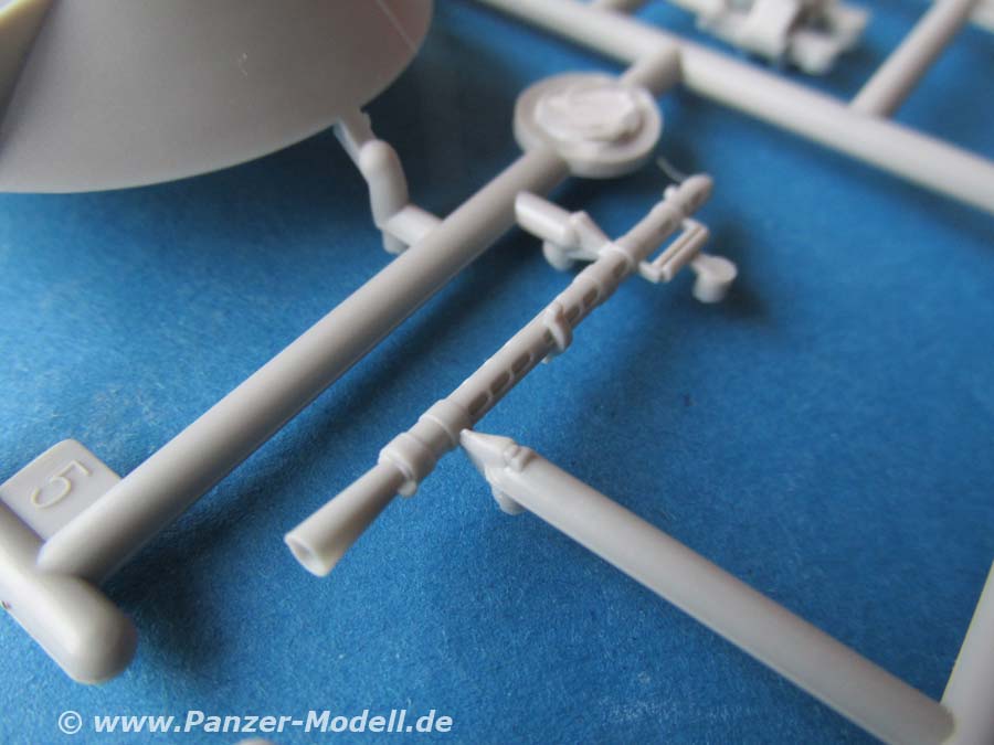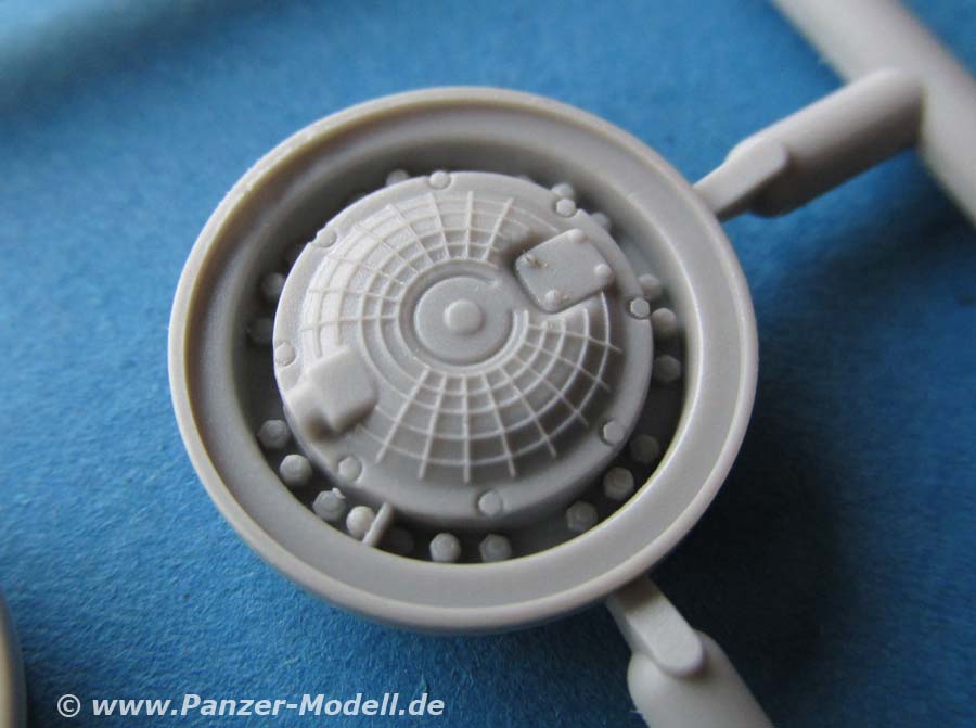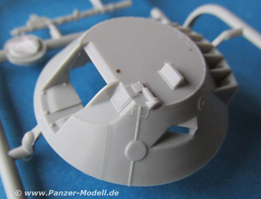 Der Turm ist soweit in einem Stück komplett gespritzt und wird mit etwas Innenleben und aussen mit den Nebeltöpfen und natürlich dem MG Rohr versehen. Dieses ist aus Plastik und dafür recht ansehnlich. Auch ein Schießscheinwerfer oberhalb des MGs ist vorhanden.
