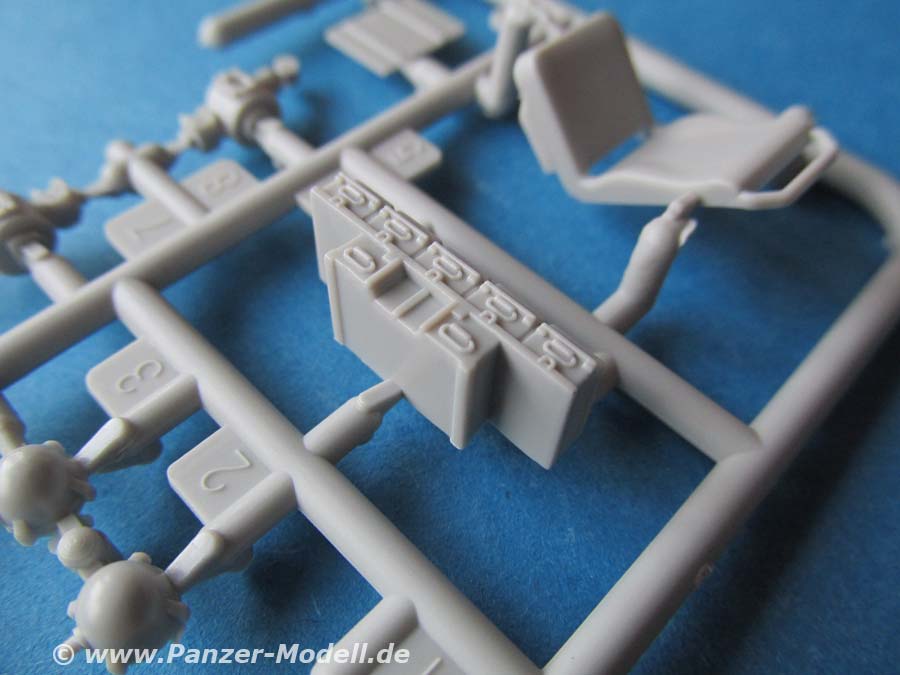 In diesem Fall haben wir je zwei Bodenplatten mit schönen Musterprägungen und den darauf befindlichen Sitzen und weiteren Details. Dazu kommen dann weitere Details wie die Armaturen für den Fahrer, Funkgeräte und Ausrüstung für die Infanteristen im hinteren Teil des Fahrzeugs. Das Einzige was leider nicht dargestellt ist, ist der Motorraum nebst Motor.