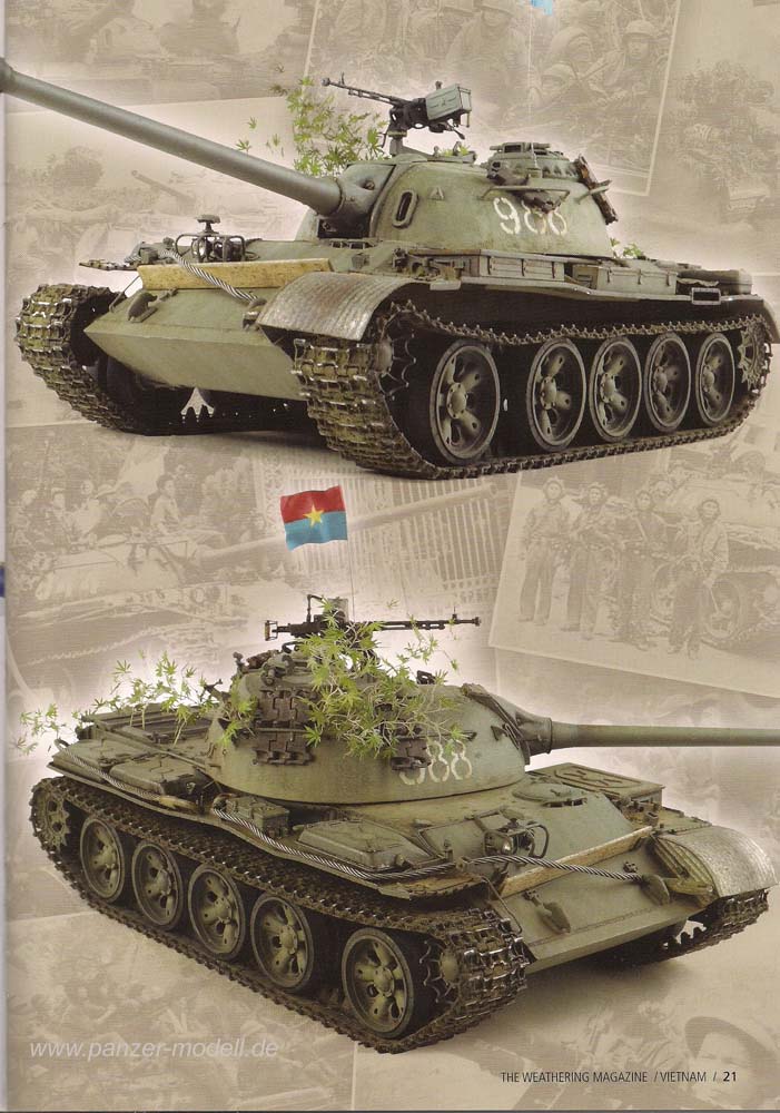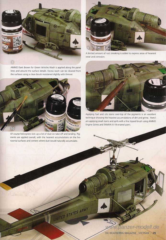 Doch zurück zum eigentlichen Thema: Ab Seite 6 beginnt ein Bericht zum M48A3 Patton von Dragon in 1:35. John Murphi geht ausführlich auf die Bemalung und Verschmutzung des Panzers im Kampfeinsatz ein. Anschließend berichtet Ian Hamilton über einen T-55 der Nordvietnamesischen Armee. Auch hier wird ausführlich die Bemalung, Alterung und Verschmutzung beschrieben. Es folgen dann Hinweise zur realistischen Verschmutzung von Modellen in Vietnam. Und natürlich kommen hier neben diversen Ölfarben hauptsächlich Produkte der Ammo of Mig-Serie zum Einsatz. Beim Thema Vietnam dürfen auch Figuren nicht fehlen. Und wenn man die Stichworte Vietnam und Figuren hört… da kommt einem sofort BRAVO 6 in den Sinn. Vladimir Demchenko stellt zwei seiner Figuren vor und erläutert die Bemalung Schritt für Schritt. Mit dem Titel Shark Attack präsentiert uns Yang Yu-Pei einen Bell Kampfhubschrauber. Das Modell wird mit einer spektakulären Bemalung und Alterung auf den Seiten 26 bis 31 vorgestellt. Vietnam: Dazu gehört natürlich auch die Gestaltung einer Dschungel-Szene. Vladimir Demchenko zeigt an einer kleinen Vignette die realistische Gestaltung einer kleinen Szene im vietnamesischen Urwald. Die Figur auf der Vignette wird zur Nebensache, der Schwerpunkt liegt hier ganz klar auf der Pflanzenwelt. Und was darf in Vietnam nicht fehlen? Richtig, die Phantom! Jamie Haggo stellt uns seine Phantom in 1:48 von Academy vor. Und auch das Gegenstück, die Mig 17 in Diensten der NVA wird ausgiebig bemalt und gealtert.. Die Gestaltung einer Vignette mit etwas Bewuchs und einem Gewässer wird durch Jean-Bernard André auf den Seiten 46 bis 48 vorgestellt. Etwas Science Fiction darf auch nicht fehlen. Oishi zeigt auf den Seiten 50 bis 55 seine Version eines Kampfroboters. Unter dem Titel "Choose the right Product" zeigt uns Elizabeth Wiese wieder einmal jede Menge… an Produkten zum Thema Vietnam. Oder was habt ihr jetzt gedacht? Aus den Sortimenten von Joefix Studios und Model Scene präsentiert sie Dschungelpflanzen, von BRAVO 6 zeigt sie diverse Figuren und von Combat Models stellt sie Panzer-Modelle für die Wargamer im Maßstab 1:55 vor. Auch beim Thema Bemalung sollen die Wargamer nicht zu kurz kommen. Rubén Torregrosa bemalt drei kleine Panzer in unterschiedlichen Qualitätsstufen. Für den Basic-Level veranschlagt er einen Zeitansatz von ein bis zwei Stunden, für den Intermediate-Level muss man schon so ca. drei bis vier Stunden veranschlagen und für den Advanced Level kommen ca. acht Stunden zusammen. Ich hätte nicht gedacht dass man eine solch aufwendige Bemalung auch an einem so kleinen Panzermodell durchführen kann. Natürlich findet man auch in diesem Heft wieder reichlich Werbung, die „Postcards from the Wolrd“ kommen diesmal aus Schweden von der Modelexpo der IPMS Stockholm und vom Bulldogfest 2014 in der Slowakei.Fazit: Ich bin begeistert! 86 Seiten bringen eine geballte Ladung an Information und Inspiration. Unbedingte Kaufempfehlung! Special thanks to Ammo of Mig for the sample.