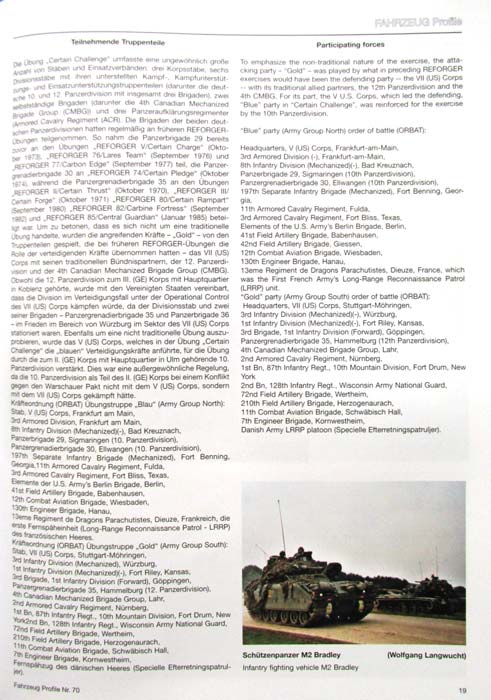 Auf den vorliegenden 48 Seiten hat das Autorenteam die letzte und größte Reforger Vollübung zu Zeiten des Kalten Krieges in Wort und Bild dokumentiert. Innerhalb dieser war die "Certain Challenge" die größte Gefechtsübung mit über 125000 Soldaten. Beteiligt waren die Armeen der USA, Kanadas, Frankreichs, Dänemarks und natürlich Deutschlands. Die Fotos sind durchgängig in Farbe und von wirklich guter Qualität. Die Bildgröße ist bei 2-3 Fotos pro Seite angenehm groß. Das Heft beginnt mit einer Einleitung und weiter durch das Heft führenden Erläuterungen zu den den Reforger Manövern, sowie dem Übungsaufbau, den Szenarien, teilnehmende Truppenteile und eine chronologische Abhandlung der einzelnen Übungswochen. Das Heft kostet 11,80 Euro und kann direkt beim Velag bezogen werden. Fahrzeug Profile Vol.70 "REFORGER 88 / Certain Challange" Diego Ruiz Palmer, Wolfgang Igert, Wolfgang Langwucht Jahr: 2016, Vertrieb: Unitec Medienvertrieb Preis: 11,80 €