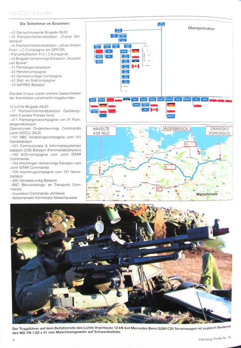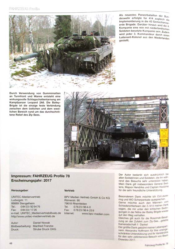 In diesem Heft mit 48 Seiten wird vom multinationalen Manöver auf dem polnischen Truppenübungsplatz Drawsko Pomorkie im Rahmen der neuen EFP Battlegroup Anfang des Jahre 2017. Die Fotos sind allesamt farbig und in guter Qualität. Der Text wie auch die Bildunterschriften sind durchgängig einsprachig in deutsch. Das Heft kostet 11,80 Euro und kann direkt beim Velag bezogen werden. Fahrzeug Profile Vol.78 "Bison Drawsko 2017 - Multinationaler Verband trainiert in Pommern" Daniel Nowak Jahr: 2017, Vertrieb: Unitec Medienvertrieb Preis: 11,80 €