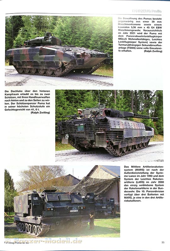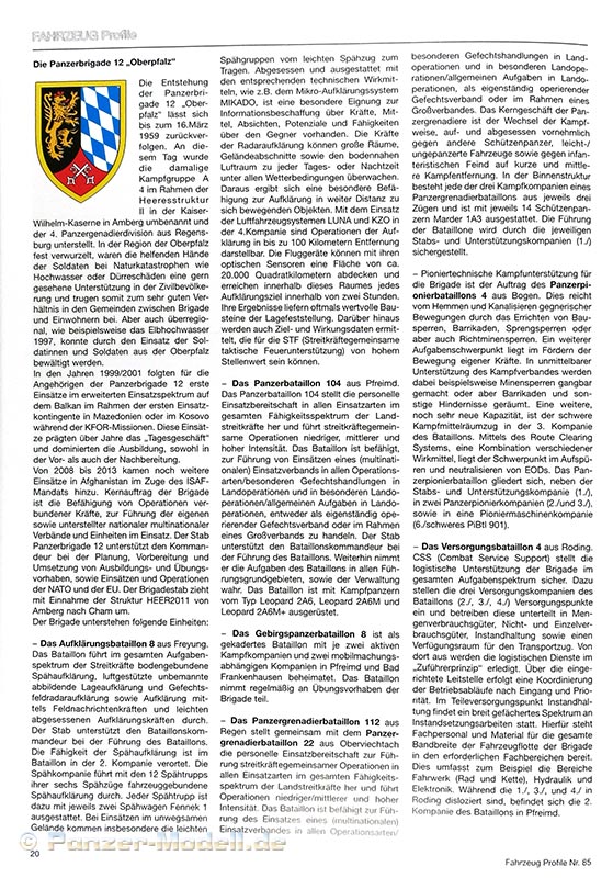 Dann geht es durch das ganze Heft weiter mit großformatigen Fotos der Fahrzeuge der einzelnen Einheiten inerhalb der Division. Darunter immer wieder Textpassagen zur näheren Information, wie etwas Aufträge der 10.Panzerdivsion oder nähere betrachung der eingegliederten Einheiten, wie der Panzergrenadierbrigade 12, Gebirgsjägerbrigade 23, Panzergrenadierbrigade 27, D/F Brigade und ihrer jeweiligen unterstellten Bataillone.