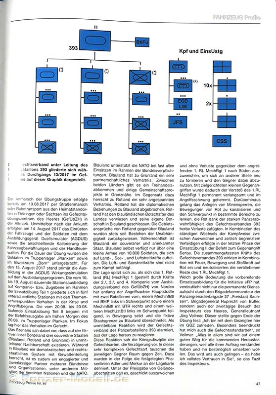 In diesem Heft mit 48 Seiten geht es um die Übungen der Panzergrenadierbrigade 37 als Vorbereitung für den Einsatz im Baltikum und Polen als Teil des mulinationalen Verbandes als vorgeschobener NATO Posten gegenüber Russland. Die Fotos im Heft sind durchgängig farbig in der heutzutage gewohnten aktuellen, guten Fotoqualität. Der Text wie auch die Bildunterschriften sind durchgängig einsprachig in deutsch. Das Heft kostet 11,80 Euro und kann direkt beim Velag bezogen werden. Fahrzeug Profile Vol.86 "Thüringer Schwert - Panzergrenadierbrigade 37 im Training für NATO Enhanced Forward Presence" Daniel Nowak Jahr: 2018, Vertrieb: Unitec Medienvertrieb Preis: 11,80 €