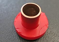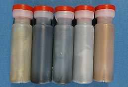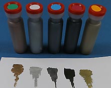 Die Farben in diesem Set sind ebenfalls in kleinen zylindrischen Plastikbehältern mit Plastikstopfen. Letztere sind mit farbigen Punkten versehen um zu sehen welche Farbe sich darin befindet.