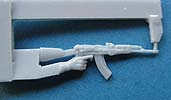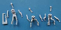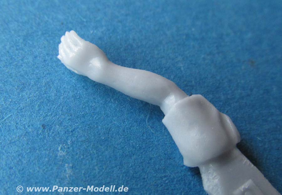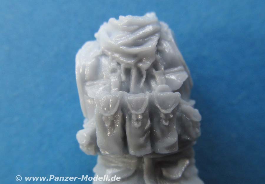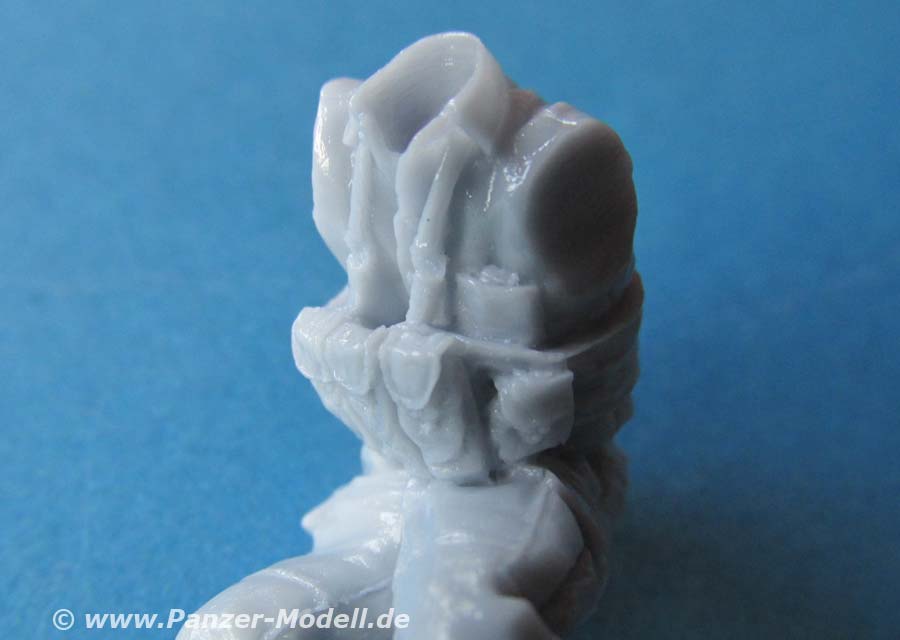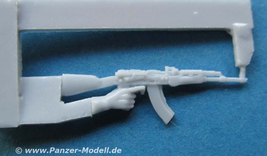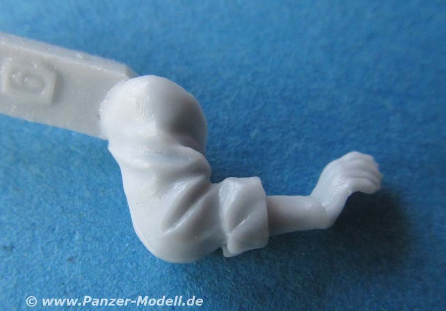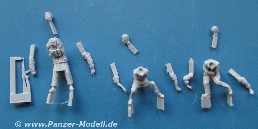 Alle drei Figuren sind bereits komplett gegossen, dass nur noch Kopf und beide Arme angeklebt werden müssen. Bei einer Figur muss zusätzlich noch die rechte Hand angeklebt werden, die bereits mit einem Schnellfeuergewehr zusammengegossen ist.