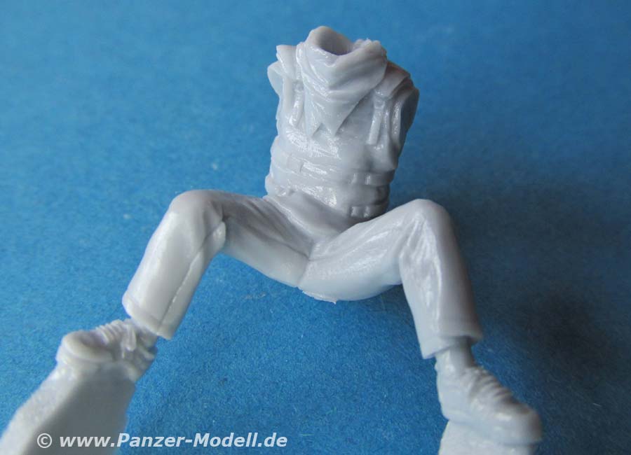 Aber man hat hier an alles gedacht. Die Ausstattung der verschiedenen Figuren mit unterschiedlichen details ist eine freude für das Auge. Während die eine Figur mit Gewehr und Magazintaschen daherkommt, sitzt die andere Figur in Jeans und Turnschuhen da und die dritte mit Sonnenbrille, Magazintaschen und Kampfstiefeln. Die Darstellung der Details ist sehr gut, der Faltenwurf der verschiedenen Kleidung ganz ausgezeichnet und die Köpfe mit den verschiedenen gesichtern und Details wie Sonnenbrille, Bart, Kofptuch, etc. ein echter Hinkucker!