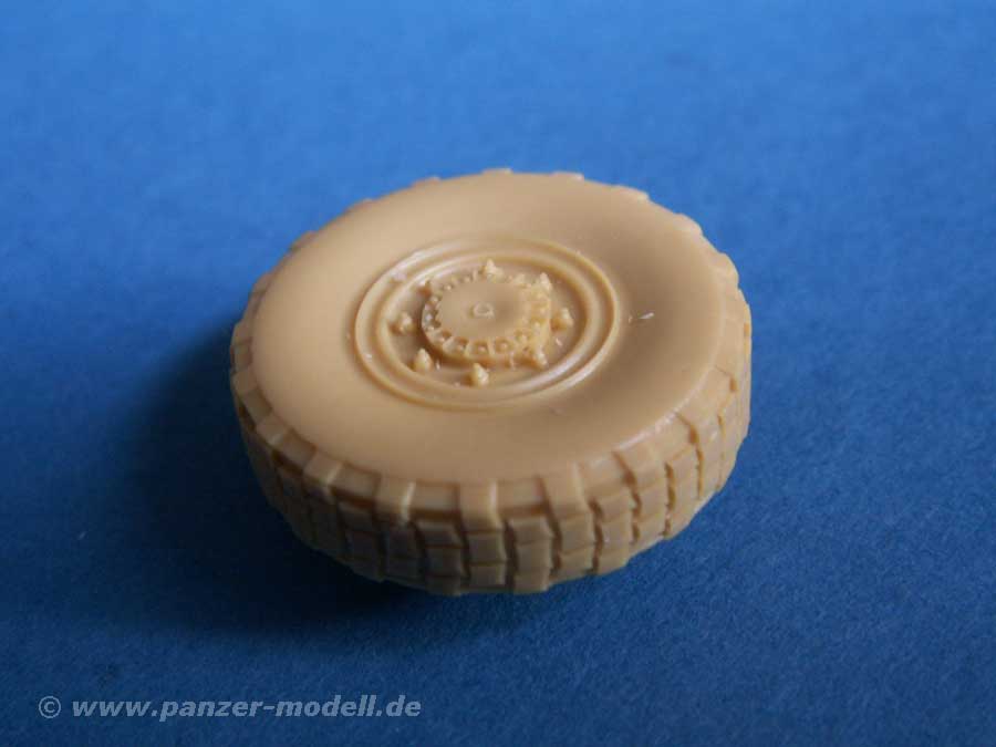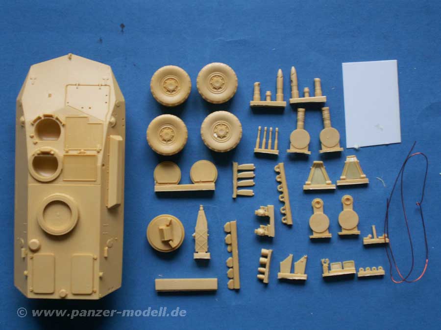 Die übrigen Resinteile sind die entsprechenden Anbauteile und Reifen - diese weisen minimale Angüsse auf, die schnell abgetrennt sind. Die Unterwanne hat bereits die Details für die Radaufhängung mit angegossen - hier fallen also keine weiteren Arbeiten an ausser der Radaufhängung und den Steuer/Spurstangen! Die übrigen Teile sind z.B. Propeller, Steuerblätter, Hinterachse, Abschlepphaken, Scheinwerfer, Luken, Rückspiegel, Ösen und das lafettierte MG (wie bei den frühen Mardern).
