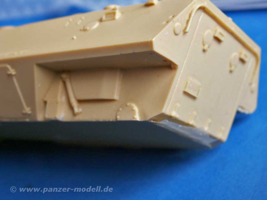 Das Herzstück des Bausatzes ist die in einem Teil und bereits mit vielen Details gegossene Wanne aus Resin. Trotz der Größe und den Details findet man hier weder Luftbläschen noch Verzug und hat dabei noch wunderbare Details.