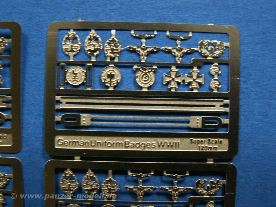 Im Set enthalten sind knapp 40 Resinteile für insgesamt vier Figuren, von denen drei Halbfiguren und eine Vollfigur. Die Details sind zum einen schon sehr gut und fein dargestellt und können durch die vier Platinen mit Fotoätzteilen für Orden und andere Abzeichen noch weiter verfeinert werden.