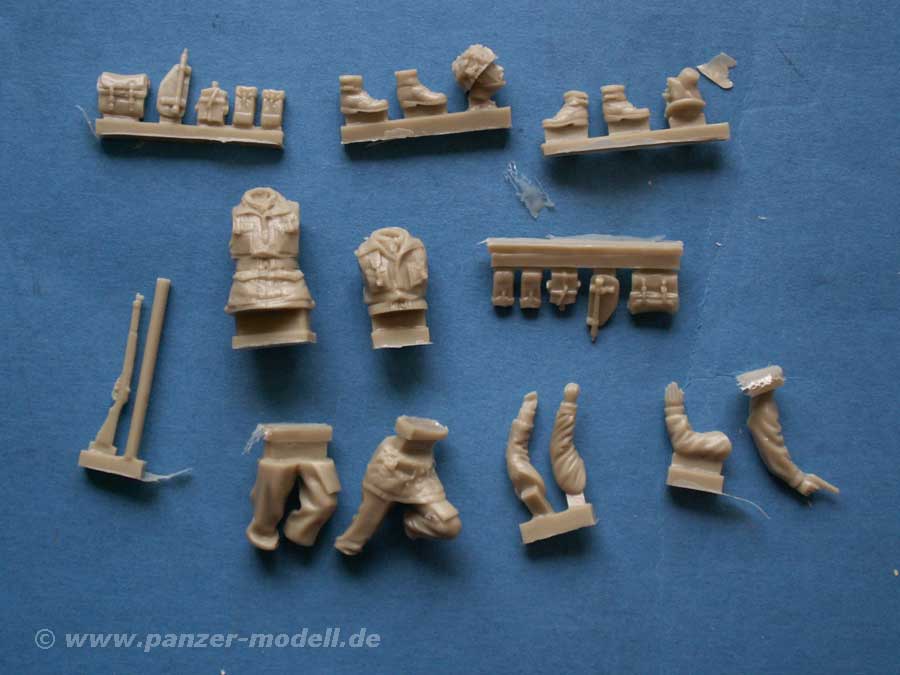 Die Körper sind in jeweils 7 Teile aufgebrochen, was noch ein bißchen Bewegungsfreiheit bei der Gestaltung lässt. Die Köpfe weisen verschiedene Kopfbedeckungen auf, einmal mit Helm und Tarnung und einmal mit Barett.