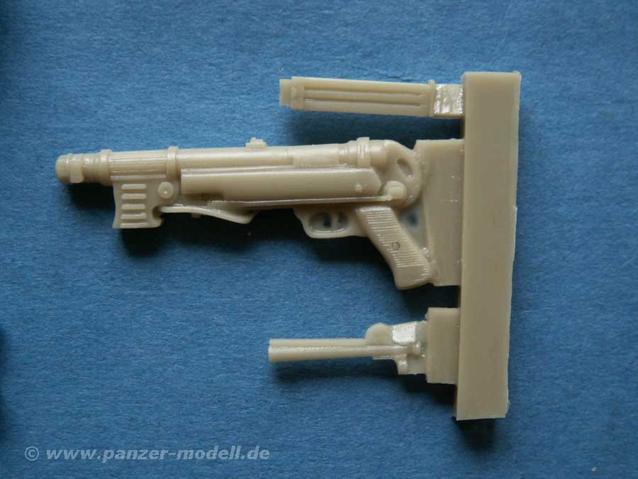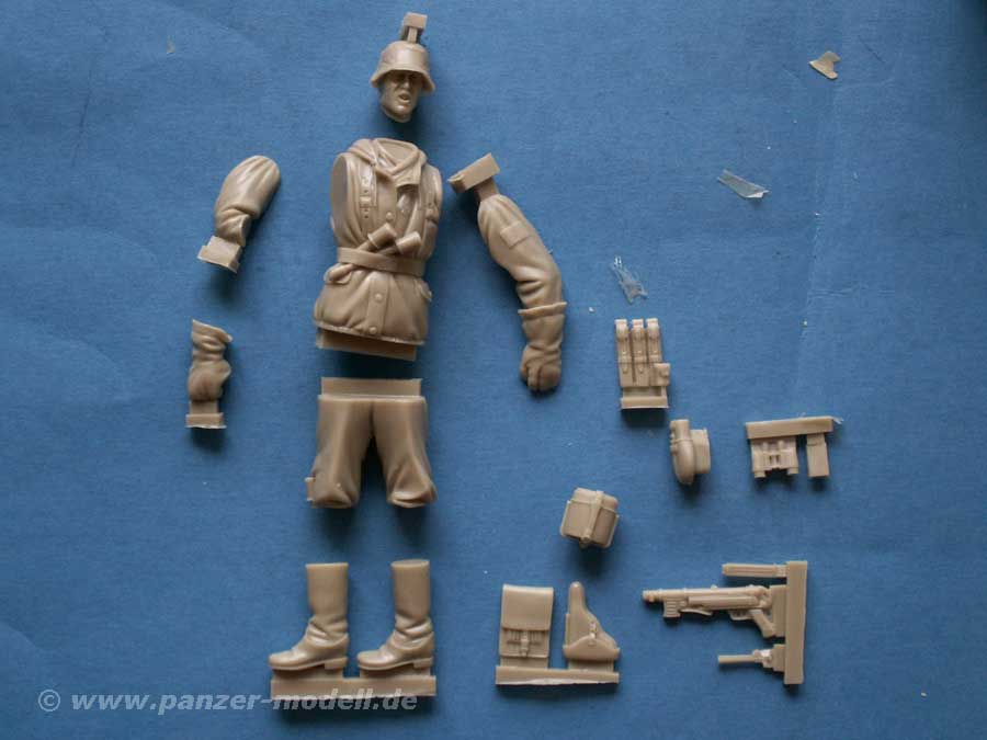 Klasse gemacht sind die Details an der Uniform bzw. die Ausrüstung. Die eingesteckten Stielhandgranaten - sogar im Stiefel - sind exzellent dargestellt. Die Magazintaschen, das andere persönliche Zubehör und ganz besonders die MP machen optisch wirklich viel her mit feinen Details, die sich in diesem Maßstab auch gut darstellen lassen.