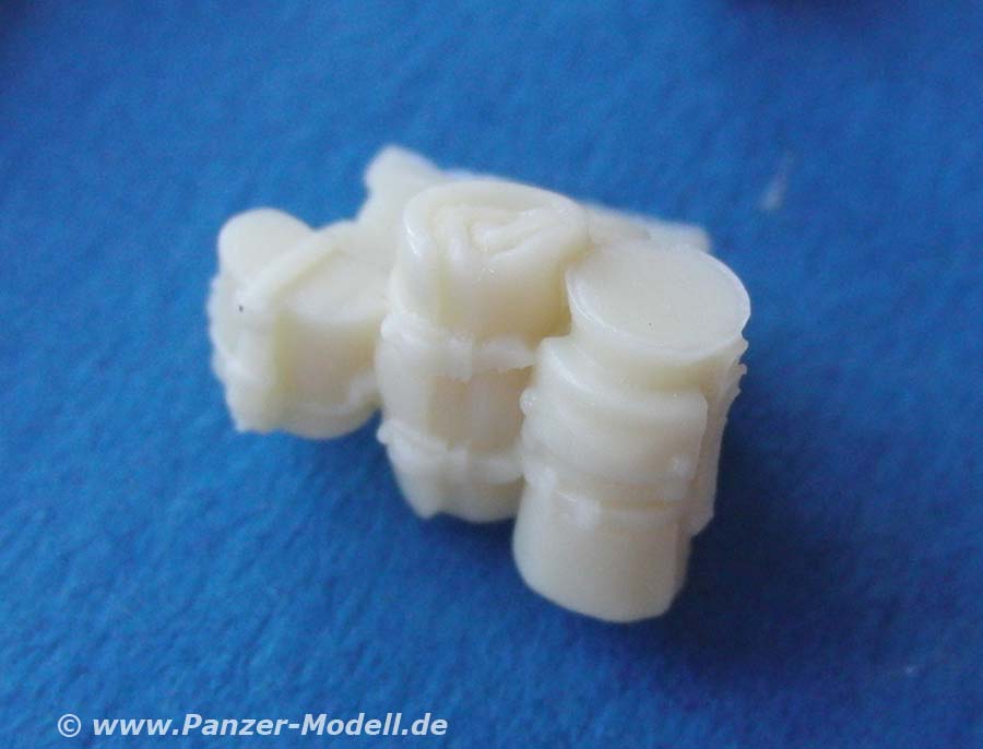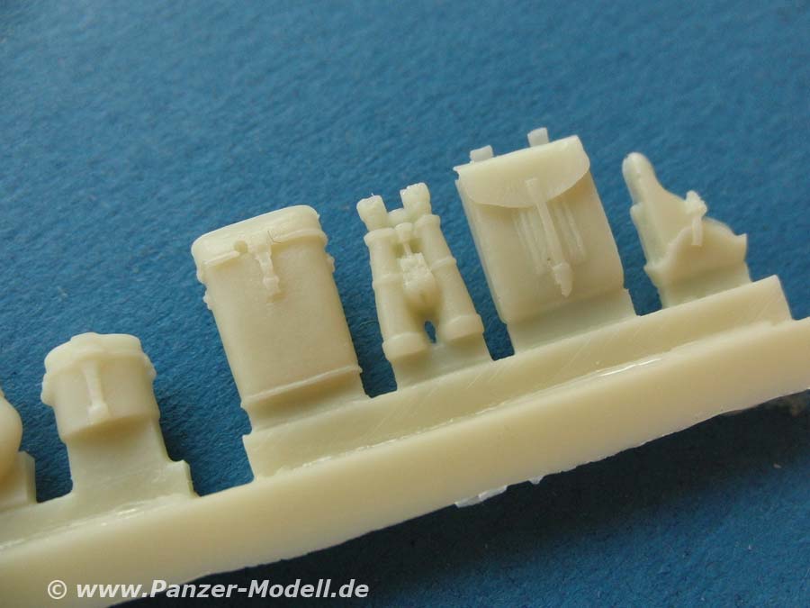 Die Auswahl an Zubehör ist richtig gut. Neben je 4 15cm Granaten zwei unterschiedlicher Typen gibt es Kartuschenhülsen, Magazinkästen, eingerollte Planen, Taschen und persönliches Gepäck, Kanister, Handwaffen wie Panzerfaust, MPs und Karabiner, Vorratsbehäter, usw.