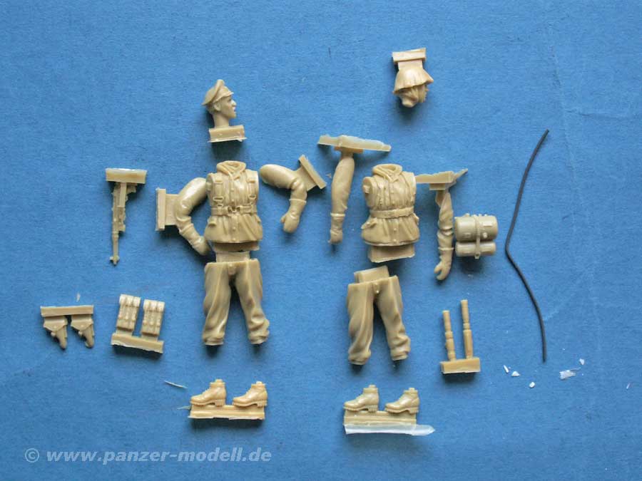 Dieses Set beinhaltet kanpp über 20 Resinteile zum Bau von zwei Figuren. Diese stellen einmal eine Figur mit Flammenwerfer und eine Figur mit MP dar.