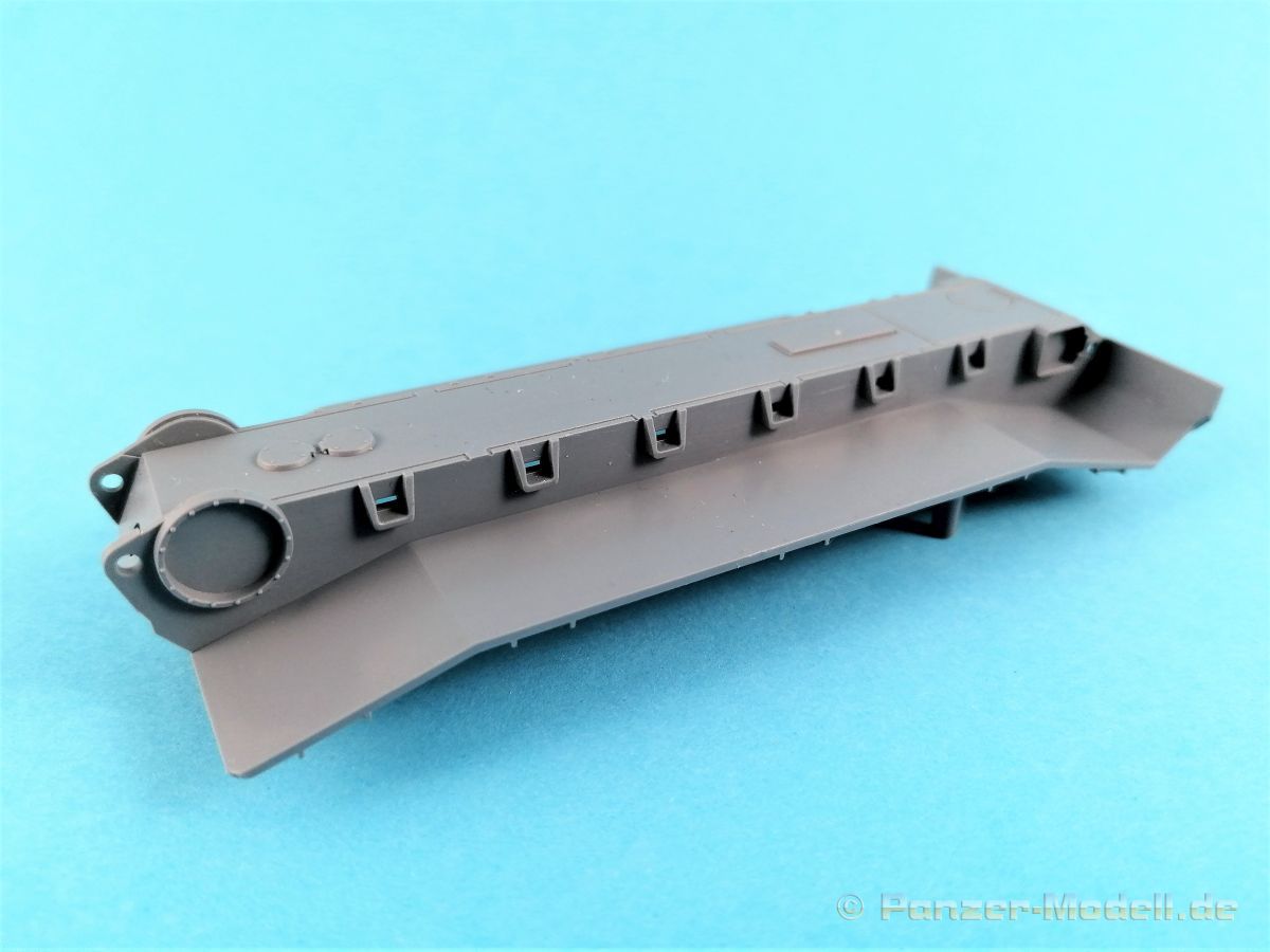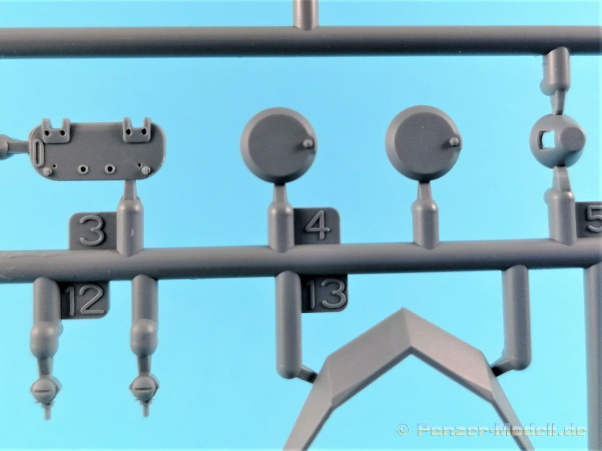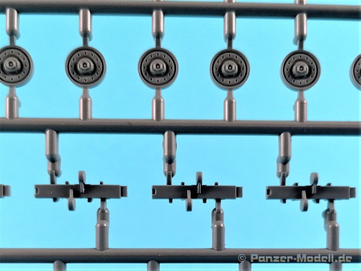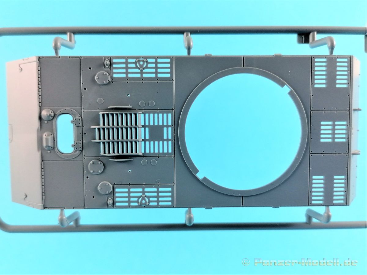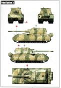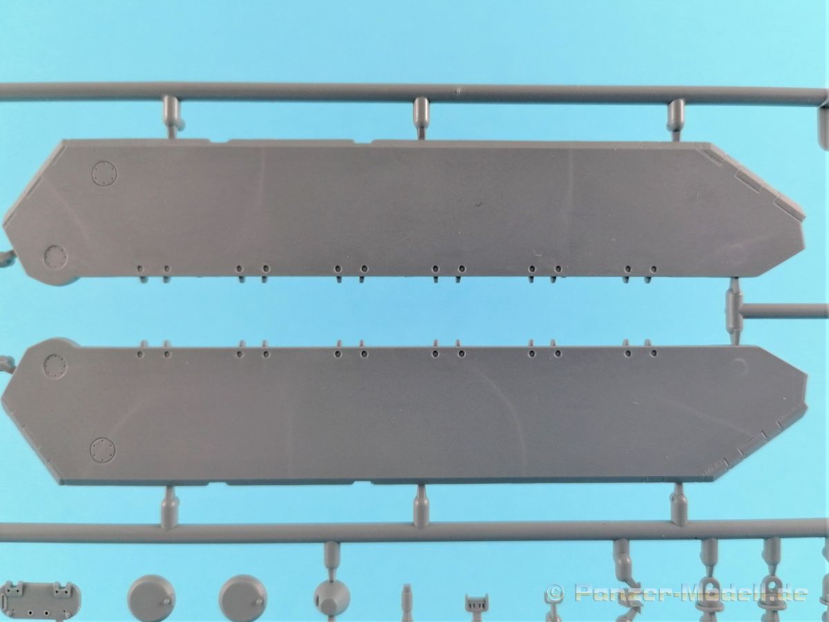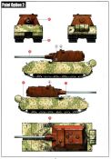 Schauen wir uns doch einmal an, was der praktische Stülpkarton (26 x 16 x 5 cm) mit seiner sehr schönen Boxart uns bietet. Das sind einmal sieben in hellgrauem Plastik hergestellte Spritzlinge, ein Turm, eine Panzerunter- und eine Oberwanne. Dazu kommen noch eine PE-Platine, ein gedrehtes Metallrohr und Decals sowie die Bauanleitung mit neun Seiten. Schon der erste Blick auf die Spritzlinge zeigt erneut eine auf absolut hohem Niveau stehende Gußqualität. Alle Teile sind sauber gespritzt und formtechnisch auf der Höhe der Zeit, mit einem hervorragenden Detaillierungsgrad. Versatz oder gar Fischhäute konnte ich keine entdecken. Formtechnisch dürfte aber alles ausgereizt sein. Die Unterwanne ist aus einem Stück gemacht und auch im unteren Bereich mit verschiedenen Details versehen. Zwei Rahmen beherbergen die Segmentketten die ebenfalls eine fantastische Detaillierung aufweisen. Für die Rundungen an Treib- und Leiträdern wurden je zwei Kettenglieder zusammengefasst. Sehr schöne Lösung. Auch das gesamte Laufwerk, verteilt auf zwei weitere Rahmen kann überzeugen, angefangen von den Schwingarmen bis hin zu den Rädern mit ihren Bolzen. Es liegt in der Natur der Sache das fast das gesamte Laufwerk hinter den seitlichen Panzerplatten verschwindet. Das gesamte Räderwerk findet an der Unterwanne seinen Platz. Die beiden dicken Seitenbleche, die optisch den Großteil des Panzers ausmachen sind ebenfalls sehr schön gemacht - sauber und ohne Verzug und vor allem mit feinen Details. Gerade die Schweißnähte und Schnittkanten der massiven Panzerplatten sind tadellos ausgeführt. Alle Oberfächen des Panzers wirken etwas rauh und kommen den originalen Panzerplatten vom Effekt her etwas näher. Die Oberwanne ist ebenfalls einteilig und wird passgenau mit Steckstiften auf die Unterwanne gesetzt. Die Lüfter sind allesamt durchbrochen dargestellt und werden von innen mit feinen geätzten PE Gittern vervollständigt. Der Einstieg des Fahrers kann offen oder geschlossen dargestellt werden. Der Hecktank ist top umgesetzt - besonders daß die zweiteilige Ausführung keine Halbschalen, sondern zwei Rundteile sind. Die Leitung zum Motor müsste allerdings in Eigenregie erstellt werden. Das Turmoberteil ist einteilig gespritzt mit ebenfalls schönen Details und punktet auch hier mit den Schweißnähten und Schnittkanten der Panzerplatten. Dieses Trumm erinnert an den Turm des E-100. Über der Hauptwaffe ist ein kleiner “Bürzel” ersichtlich. Der Sinn entzieht sich mir allerdings. Ist das eine weitere Kanone oder ist das ein Teil der Visiereinrichtungen? Alle Luken können offen oder geschlossen verbaut werden. Ein Entfernungsmesser wird zum Abschluß auf der Deckplatte des Turms montiert. Eine Nachsichtanlage kann optional angebaut werden. Bleibt noch die Montage des Rohrs. Als gedrehtes Metallrohr oder als ebenfalls hervorragendes Gußteil mit offener Mündung. Man hat die Wahl… Schön auf jeden Fall ist die Tatsache das die “Slide Mould”-Technik bei allen relevanten Teilen zum Einsatz kam. Und damit sind wir schon bei der im DIN A 5 Format gehaltenen Bauanleitung… In insgesamt neun Schritten ist der Bau des Panzers abgehandelt. Auf der ersten Seite gibt es wie üblich Hinweise zu den Piktogrammen, Sicherheitshinweise und Verarbeitungshinweise zu den Decals. Eben das übliche… Auf der zweiten Seite die Aufstellung der Spritzlinge und eine Übersicht der Farbhersteller. Genannt sind Mr. Hobby, Hobby Color, Humbrol und Tamiya. Die Baustufen sind relativ übersichtlich, sauber erstellt und dürften keine Probleme bereiten. Die sauber gedruckten Decals machen ebenfalls einen sehr guten Eindruck. Drei Bemalungsvorschläge stehen zur Auswahl. Diese sind im Bildteil enthalten. Ein toller Kit, der auch von einem fortgeschrittenen Anfänger durchaus zu bauen ist und zudem eine nette Bereicherung in der Vitrine.