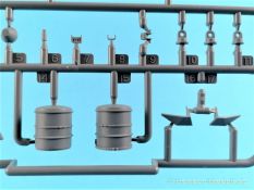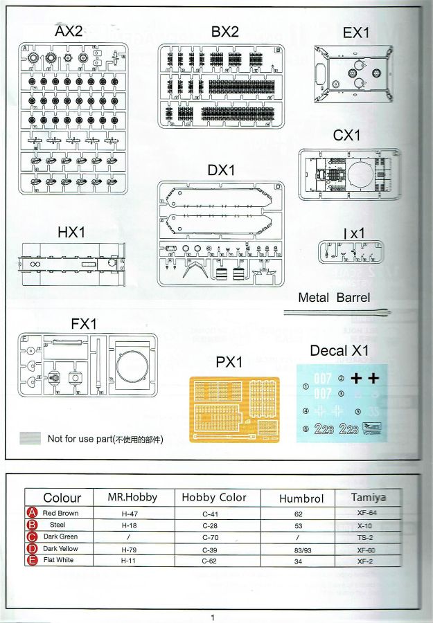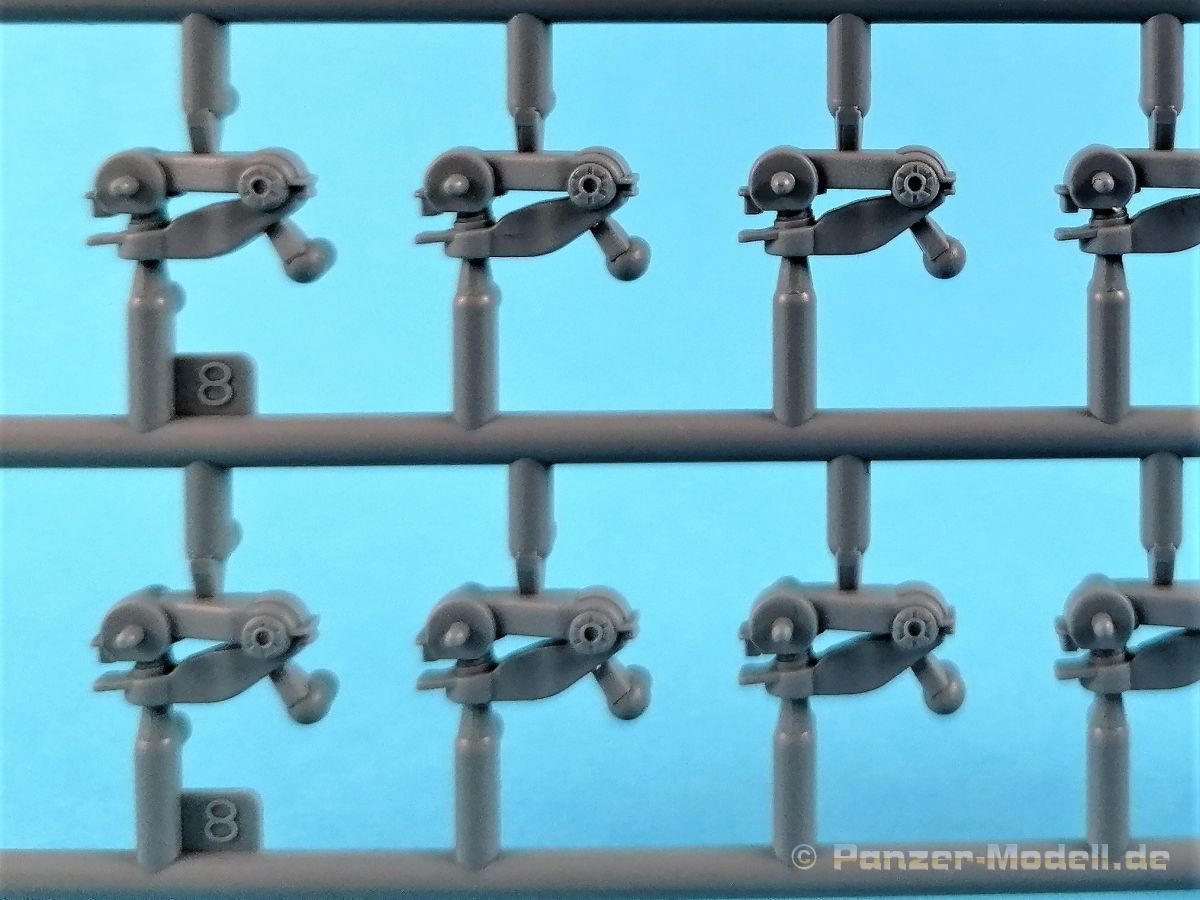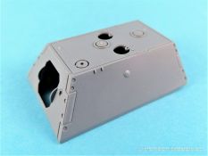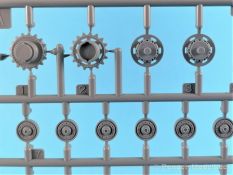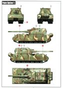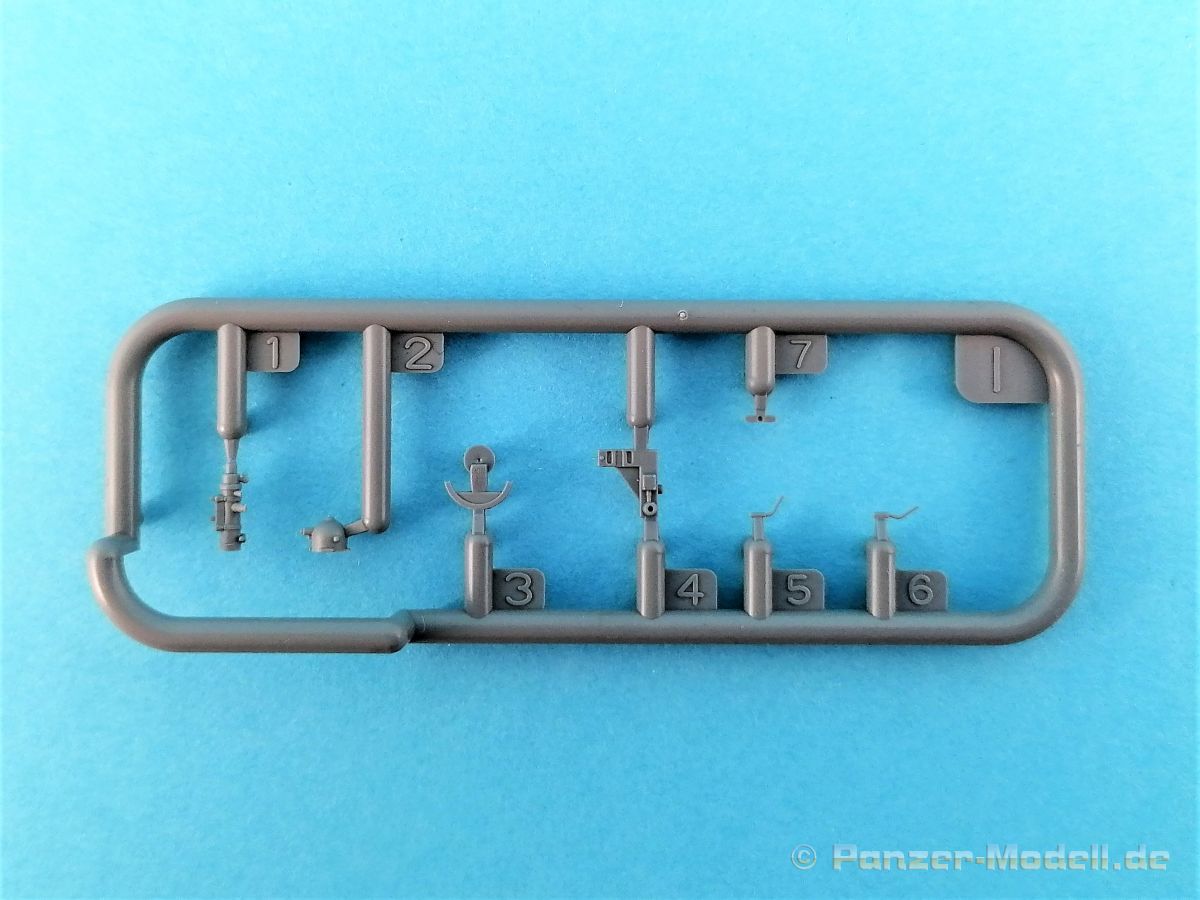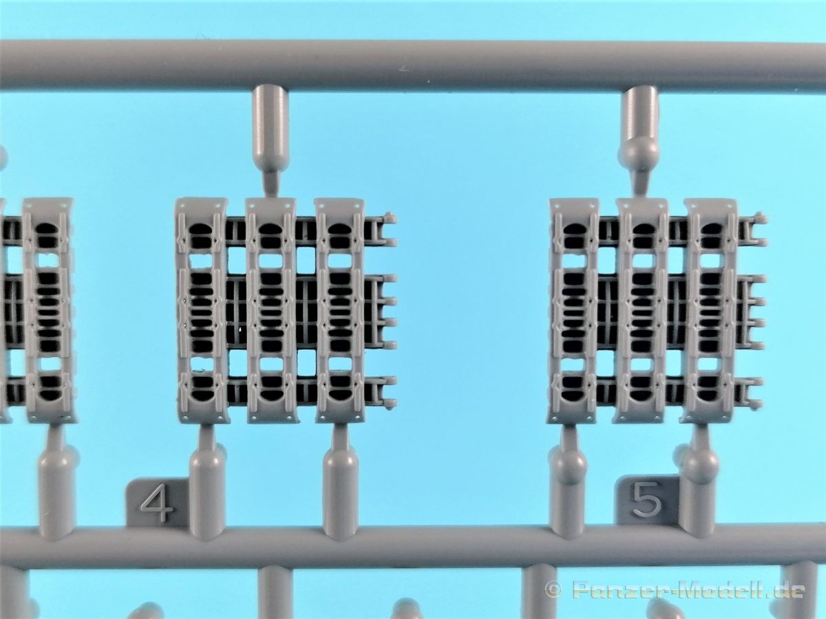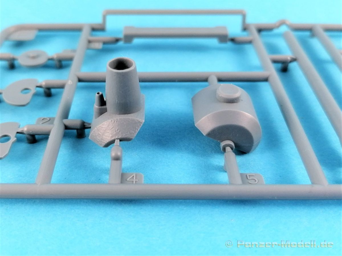 Schauen wir uns doch einmal an, was der praktische Stülpkarton (26 x 16 x 5 cm) mit seiner sehr schönen Boxart uns bietet. Das sind einmal sieben in hellgrauem Plastik hergestellte Spritzlinge, ein Turm, eine Panzerunter- und eine Oberwanne. Dazu kommen noch eine PE-Platine, ein gedrehtes Metallrohr und Decals sowie die Bauanleitung mit neun Seiten. Schon der erste Blick auf die Spritzlinge zeigt erneut eine auf absolut hohem Niveau stehende Gußqualität. Alle Teile sind sauber gespritzt und formtechnisch auf der Höhe der Zeit, mit einem hervorragenden Detaillierungsgrad. Versatz oder gar Fischhäute konnte ich keine entdecken. Formtechnisch dürfte aber alles ausgereizt sein. Die Unterwanne ist aus einem Stück gemacht und auch im unteren Bereich mit verschiedenen Details versehen. Zwei Rahmen beherbergen die Segmentketten die ebenfalls eine fantastische Detaillierung aufweisen. Für die Rundungen an Treib- und Leiträdern wurden je zwei Kettenglieder zusammengefasst. Sehr schöne Lösung. Auch das gesamte Laufwerk, verteilt auf zwei weitere Rahmen kann überzeugen, angefangen von den Schwingarmen bis hin zu den Rädern mit ihren Bolzen. Es liegt in der Natur der Sache das fast das gesamte Laufwerk hinter den seitlichen Panzerplatten verschwindet. Das gesamte Räderwerk findet an der Unterwanne seinen Platz. Die beiden dicken Seitenbleche, die optisch den Großteil des Panzers ausmachen sind ebenfalls sehr schön gemacht - sauber und ohne Verzug und vor allem mit feinen Details. Gerade die Schweißnähte und Schnittkanten der massiven Panzerplatten sind tadellos ausgeführt. Alle Oberfächen des Panzers wirken etwas rauh und kommen den originalen Panzerplatten vom Effekt her etwas näher. Die Oberwanne ist ebenfalls einteilig und wird passgenau mit Steckstiften auf die Unterwanne gesetzt. Die Lüfter sind allesamt durchbrochen dargestellt und werden von innen mit feinen geätzten PE Gittern vervollständigt. Der Einstieg des Fahrers kann offen oder geschlossen dargestellt werden. Der Hecktank ist top umgesetzt - besonders daß die zweiteilige Ausführung keine Halbschalen, sondern zwei Rundteile sind. Die Leitung zum Motor müsste allerdings in Eigenregie erstellt werden. Das Turmoberteil ist einteilig gespritzt mit ebenfalls schönen Details und punktet auch hier mit den Schweißnähten und Schnittkanten der Panzerplatten. Dieses Trumm erinnert an den Turm des E-100. Über der Hauptwaffe ist ein kleiner “Bürzel” ersichtlich. Der Sinn entzieht sich mir allerdings. Ist das eine weitere Kanone oder ist das ein Teil der Visiereinrichtungen? Alle Luken können offen oder geschlossen verbaut werden. Ein Entfernungsmesser wird zum Abschluß auf der Deckplatte des Turms montiert. Eine Nachsichtanlage kann optional angebaut werden. Bleibt noch die Montage des Rohrs. Als gedrehtes Metallrohr oder als ebenfalls hervorragendes Gußteil mit offener Mündung. Man hat die Wahl… Schön auf jeden Fall ist die Tatsache das die “Slide Mould”-Technik bei allen relevanten Teilen zum Einsatz kam. Und damit sind wir schon bei der im DIN A 5 Format gehaltenen Bauanleitung… In insgesamt neun Schritten ist der Bau des Panzers abgehandelt. Auf der ersten Seite gibt es wie üblich Hinweise zu den Piktogrammen, Sicherheitshinweise und Verarbeitungshinweise zu den Decals. Eben das übliche… Auf der zweiten Seite die Aufstellung der Spritzlinge und eine Übersicht der Farbhersteller. Genannt sind Mr. Hobby, Hobby Color, Humbrol und Tamiya. Die Baustufen sind relativ übersichtlich, sauber erstellt und dürften keine Probleme bereiten. Die sauber gedruckten Decals machen ebenfalls einen sehr guten Eindruck. Drei Bemalungsvorschläge stehen zur Auswahl. Diese sind im Bildteil enthalten. Ein toller Kit, der auch von einem fortgeschrittenen Anfänger durchaus zu bauen ist und zudem eine nette Bereicherung in der Vitrine.