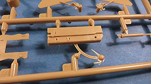 Die Kanonenlafette ist schon etwas umfangreicher mit Anbauteilen, wie etwa den Zylindern, Handkurbeln, Zahnrädern, Staukisten, dem Erdsporn und dem Schutzschild. Auch hier kommen weitere PE Teile zum Einsatz um sehr feine und dünner Details darzustellen.