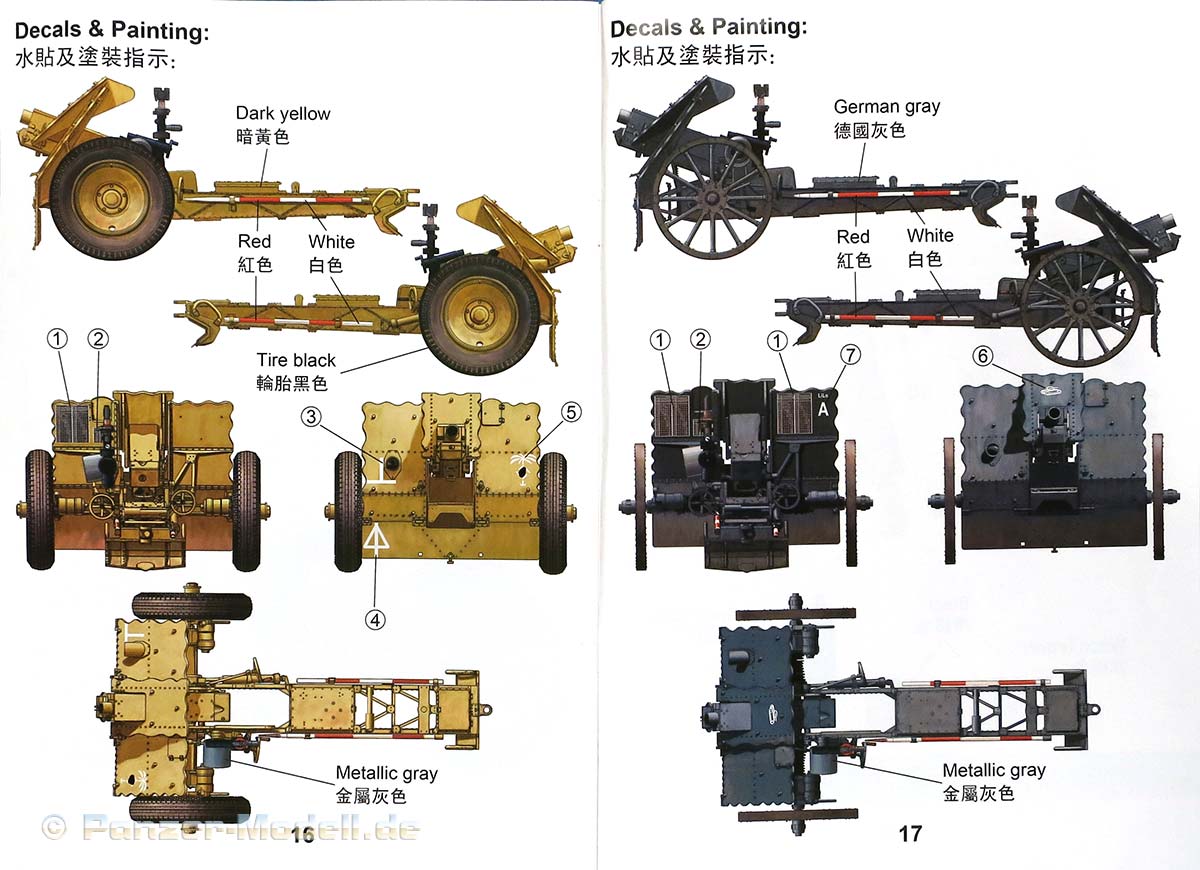 Am Ende de Bauanleitung gibt es zwei ganzseitige Übersichten mit zwei Vorschlägen zur Bemalung und Markierung, sowe eine Seite zu Bau und Bemalung der Figuren.