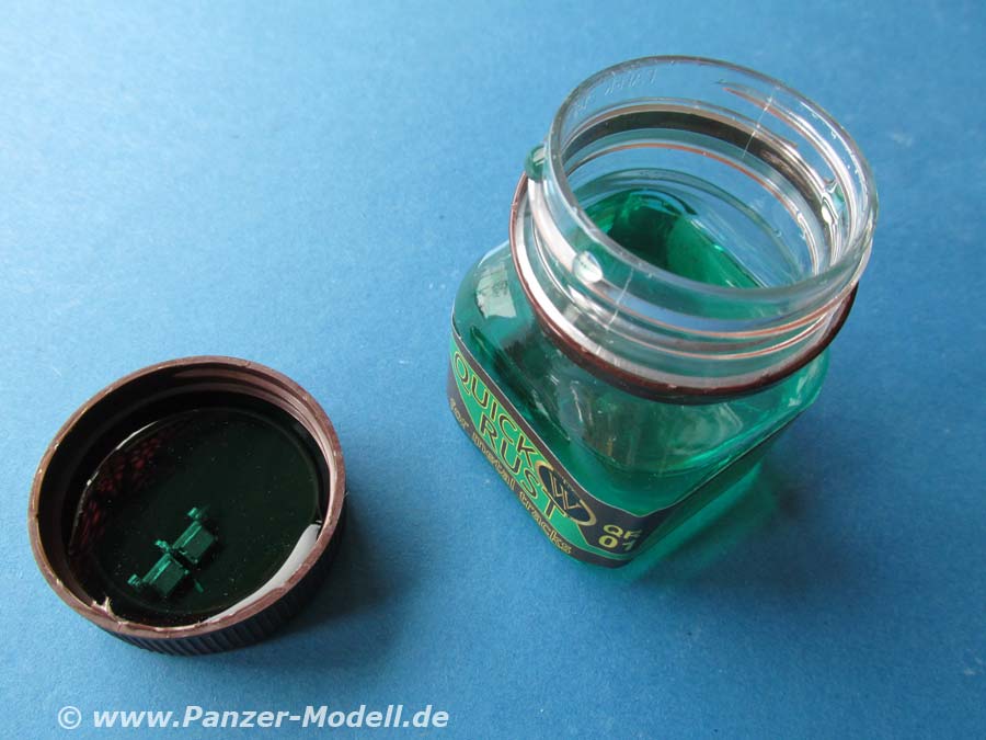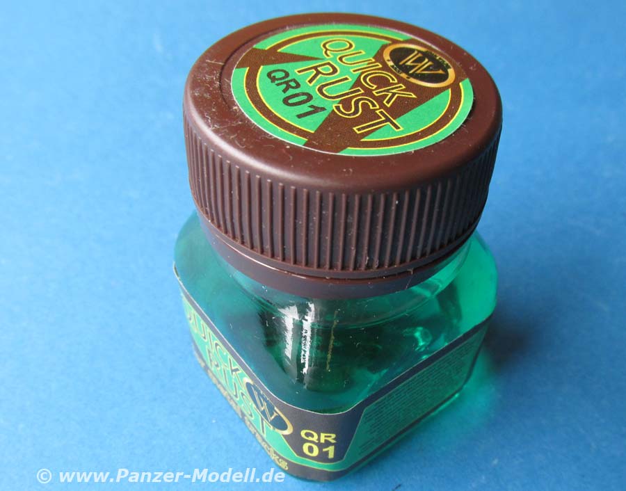 Der Quickrust ist eine grünliche Flüssigkeit, die Weißmetallteile, wie z.B. Friulmodel Ketten angreift und quasi "rosten" lässt. Je nach Einwirkzeit wird das Metall dabei mehr oder wenig intensiv gefärbt.