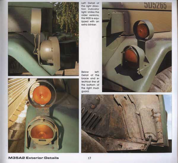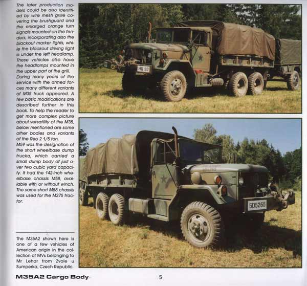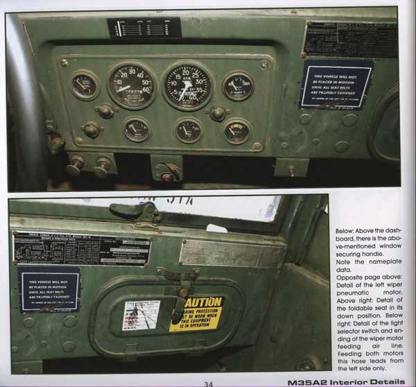 Begonnen wird mit der Fahrerkabine, die von aussen zunächst gezeigt wird, und dann auf weitere externe Details eingegangen wird, wie Beleuchtungselemente, Spiegel, Auspuffrohre, Stoßfänger mit Winde, Bereifung, Kraftstofftank, Batteriefach, Schmutzfänger, usw. Dann geht es zur Ladefläche über, wo die Befestigungeg, Spriegel, Plane, usw. gezeigt werden. Von der Fahrerkabine werden sämtliche Details wie Türinnenseiten, ablageflächen, Fensterhalterungen, Armaturen, Pedale, Schaltknüppel, Fächer, Lenkrad, Hebel, Verdeck, Spriegel, usw. gezeigt. Es folgen Aufnahmen vom Motor und Motorraum mit allen Bauelementen aus jeder Perspektive, sowie Abgasleitungen. Dann werden die einzelnen Achsen noch mit diversen Detailfotos abgehandelt, die die Aufhängung, Lenkung, Antrieb, Federn, usw. gnau zeigen. zwei Seitenzeigen dann noch kurz den M105 Anhängr, der am M35A2 genutzt wird.
