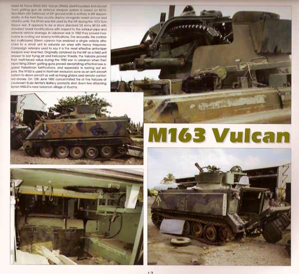 Gezeigt werden: Merkava III, M60 Magach, M60 Blazer, M48 A2/105 ISR, Achzarit, Zelda, Ben Gurion, Centurion Mk.5, M10 Achilles, Shermans, Hotchkiss H35 und 38, M5 Halbkette, Marmon Harrington, Sherman Kilshon, M163 Vulcan, M727 SP Hawk, TCM-20 AA, HS-404, M36 Keres, GMC CCKW 353/352, M36 A2, MIM-23 HAWK Launcher, HAWK AD, ZSU-57-2, BRDM-2, ZSU-23-4, Bofors 40 L70, BTR-40, usw.