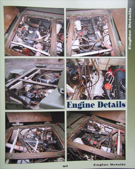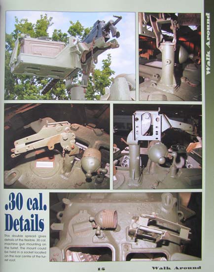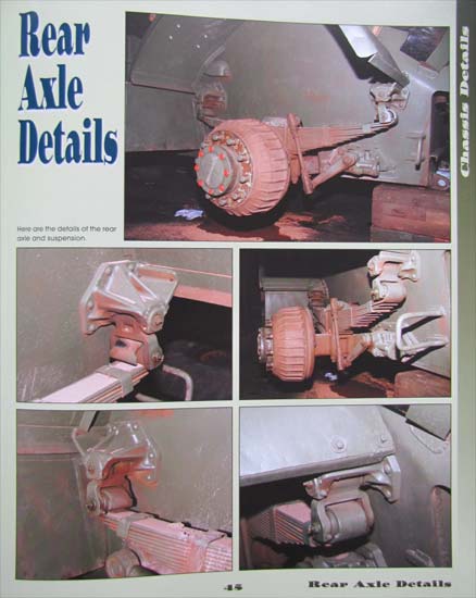Bis Seite 50 wird der Staghound dann rundherum in guten Fotos gezeigt und verschiedene Bereiche gruppiert dargestellt. So wird der Turm, die Kanone, das MG, Beleuchtung, Tank, Luken, Motordeck, usw. gezielt in mehreren Fotos gezeigt und jeweils ein paar Zeilen Text erläutern was genau an Details und spezifischen Teilen zu sehen ist. Besonders interessant ist der Abschnitt über das fahrwerk, zum einen wegen dem Blick unter das fahrzeug aber auch auf die Aufhängung ohne Räder.