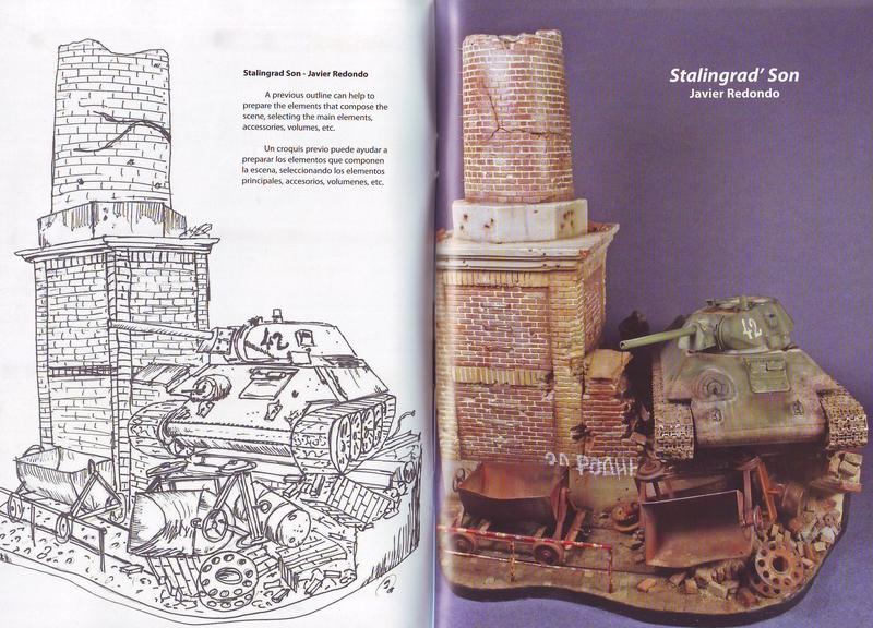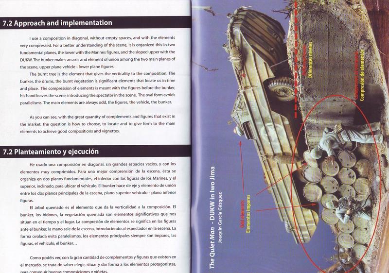 Auf knapp 30 Seiten führen Joaquín García Gázquez und Javier Redondo durch die einzelnen Kapitel. In diesen werden die einzelnen Schritte von der Idee bis zum fertigen Ergebnis erläutert. Anhand von einigen Beispielen werden die Grundlagen des Dioramenbaus wie Komposition, verschiedene Ebenen, Symmetry und Parallelität eingegangen. Durch die Photos kann man die Ergebnise gut nachvollziehen. Die Texte sind durchweg in recht leicht verständlichem Englisch, sowie Spanisch gehalten.