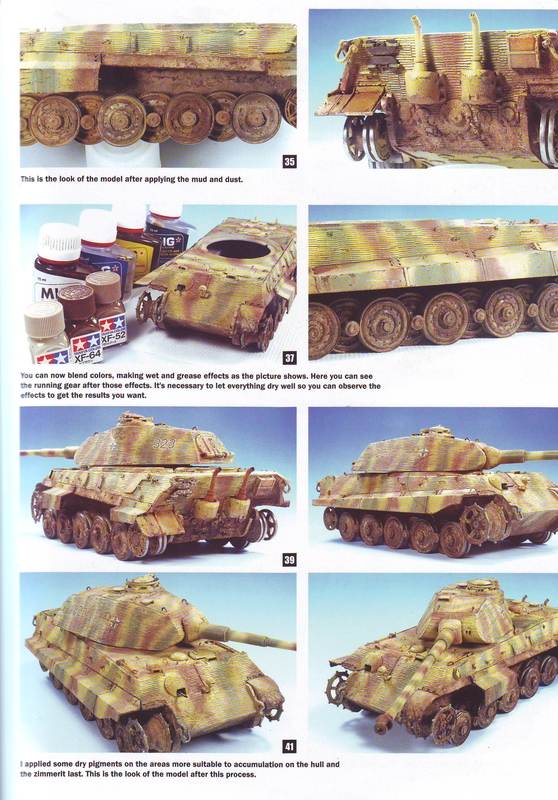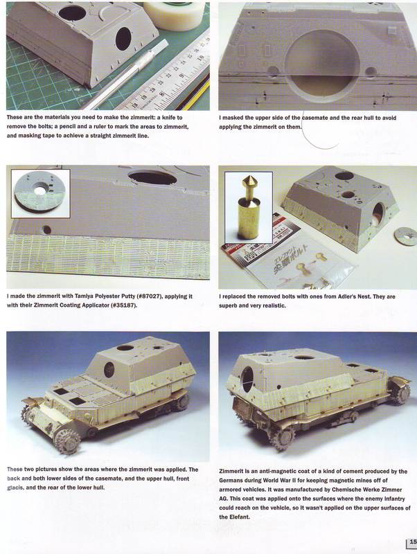 Bei der Vorstellung der Fahrzeuge geht das Buch chronologisch vor. Los geht es mit einem Panzerjäger Ferdinand von José A. de Soroa. Dieser Artikel beinhaltet u.a. einige schöne Detailaufnahmen des fertigen Fahrzeuges. Auf Basis eines Ferdinands von Dragon baute er einen schweren Panzerjäger, der bei der Schlacht von Kursk zum Einsatz kam. Die Weiterentwicklung des Ferdinand, der schwere Panzerjäger Elefant wird durch ein Modell von Domingo Hernández dargestellt. Basis ist hier ebenfalls das passende Modell aus dem Hause Dragon. Darüber hinaus glänzt dieser Artikel durch eine ausführliche Schritt für Schritt Anleitung bei der Bemalung und Alterung des Fahrzeuges.