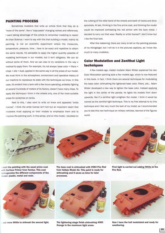 Zum Ende dieses Kapitels hat der Autor des Buches, José A. Azorín selbst mit zwei Beiträgen das Wort. Zunächst gibt es sehr schönes 'In Detail' vom Innenleben des Turmes eines Königstigers, welcher im Panzermuseum Munster ausgestellt ist. Dieser Artikel dürfte ein sehr gute Quelle für Nachbauten sein. Darüber hinaus stellt José selbst ein Modell vor, ein Tiger II mit Henschel Turm in den späten Ausführung. Interessant ist hier die Lackierung, da die Wanne 'lediglich' im Rot der Grundierung lackiert ist. Auch hier gibt es eine sehr schöne Schritt für Schritt Anleitung bei der Lackierung des Modelles, wober anzumerken ist hierbei, dass der Königstiger im sog. Modulation Style lackiert wurde.