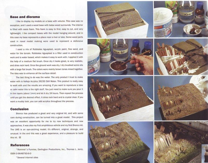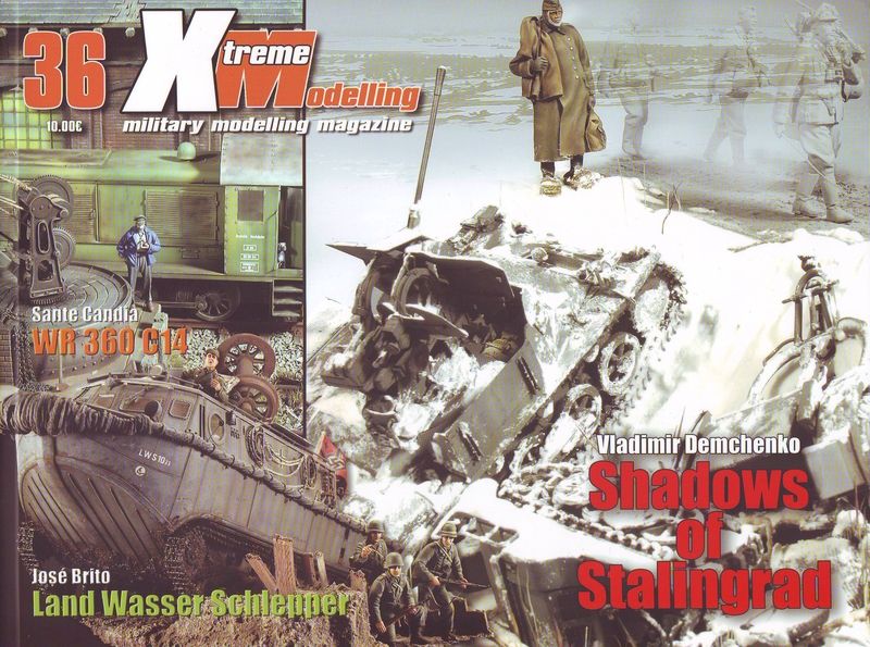 Den Anfang macht das Diorama 'Shadows of Stalingrad' von Vladimir Demschneko. Interessant an diesem Diorama ist die Tatsache, dass hier versucht wurde, auch zeitlich eine zweite Ebene einzufügen, indem gleichzeitig der Rückzug und in grau der Vormarsch der deutschen Wehrmacht gezeigt wird. Neben den Figuren ist hier ein schön gemachter Flakpanzer I im Mittelpunkt. Es folgt ein Bericht über ein eher ziviles Diorama. Sante Candia berichtet über den Bau einer WR 360 C14 Diesellokomotive von CMK. Auch hier gibt es einige schöne Bilder zu bestaunen. Weiter geht es mit 'River Crossing' von José Brito. In diesem Bericht wird der Bau eines Land Wasser Schleppers von Bronco beschrieben. Hier gibt es u.a. eine Bilderserie über die Herstellung der Taue aus Kordel. Daürber hinaus gibt es auch noch einen Teil über die Einbettung in ein passendes Diorama. Dieser Teil wird ebenfalls von einigen tollen Photos begleitet. Nun wechselt der Themenbereich in zweifacher Hinsicht. Sven Frisch beschreibt in seinem Artikel den Bau eines aktuelln M1 Abrams in 1/48. Der Schwerpunkt liegt hier in einer Bilderserie über die Bemalung des Modelles. Im letzten Baubericht dieser Ausgabe stellt Detlef Sánchez seinen E-100 vor. Auch hier gibt es einige tolle Bilder vom fertigen Modell. Den Abschluss dieser Ausgabe bildet ein ausführlichen Bericht von den Red Devils Awards 2009. Hierbei handelt es sich um ein Event, welches nur alle zwei Jahre stattfindet. Auf sehr vielen Photos wird ein Teil der gebauten Modelle vorgestellt. Alles in allem bietet auch die Ausgabe 36 der Xtreme Modelling wieder einen interessanten Streifzug durch das Hobby Militärmodellbau. Xtreme Modelling Hefte sind u.a. erhältlich bei: