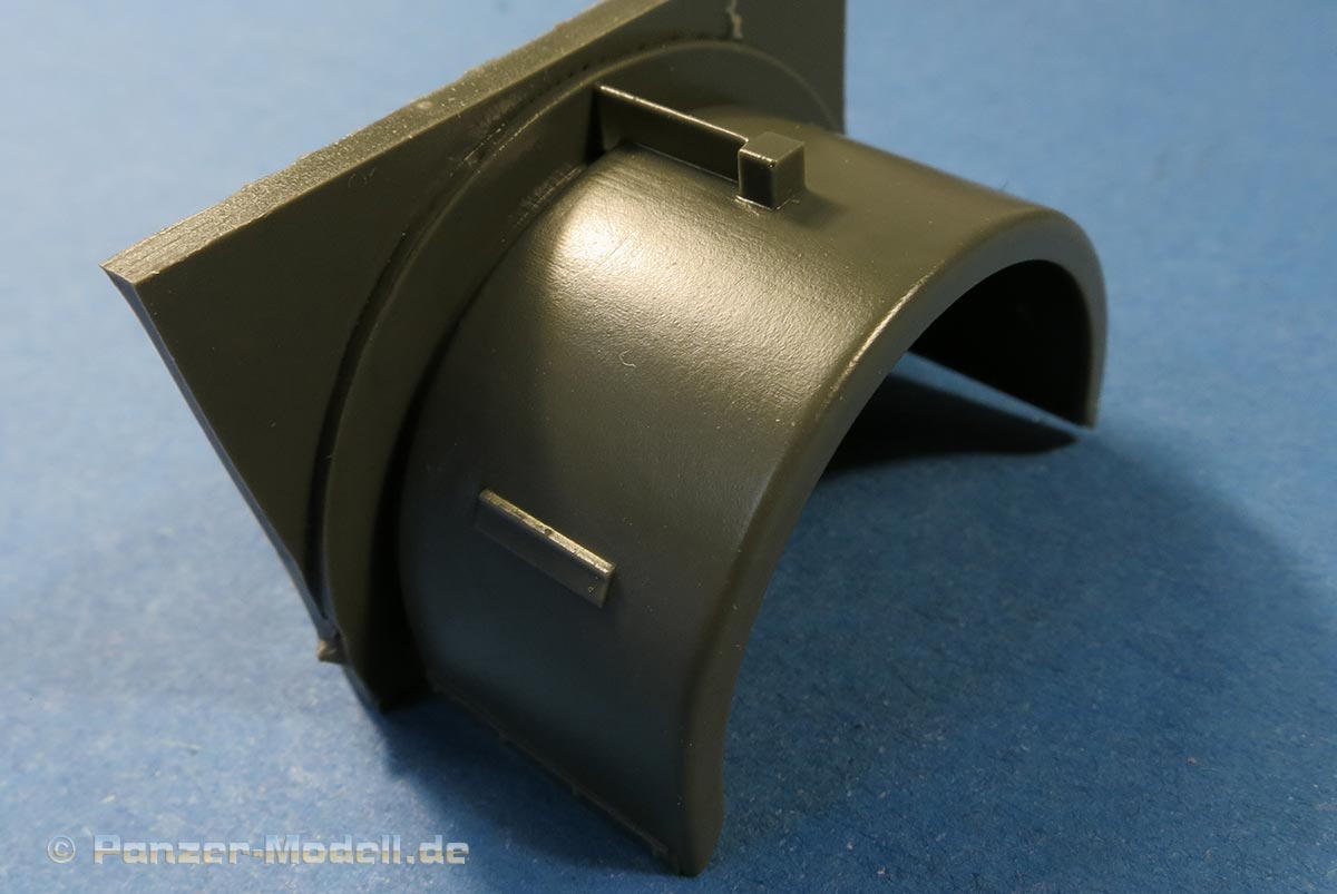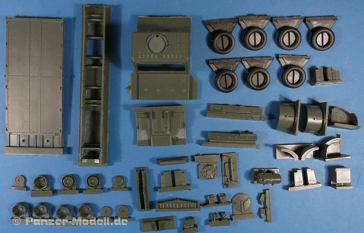 Die Anbauteile sind recht vielfältig und scharf detailliert wie die Blattfedern, Tank, Staukisten, Kanister in Halterung, Drucktanks, Unterfahrschutz, Kotflügel in sauberer und schöner Formung, usw.
