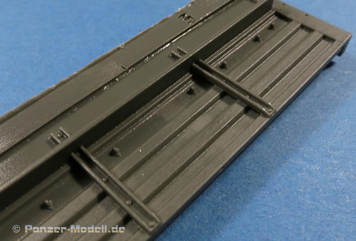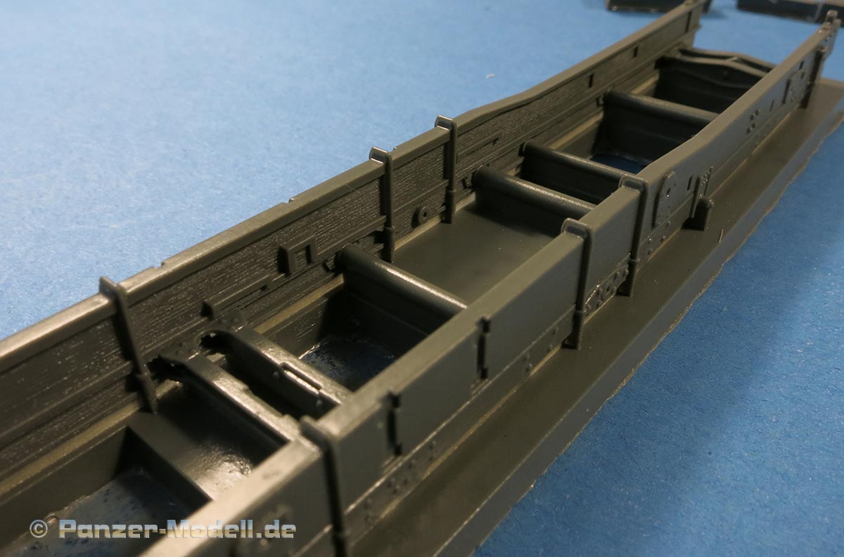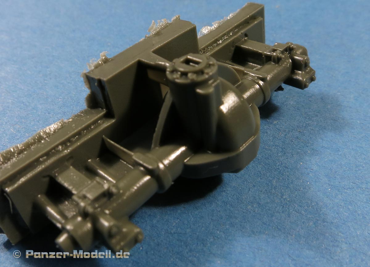 Der Fahrwerksrahmen ist mit beiden Holmen und Querträgern bereits in einem Stück gegossen, was ein großer Vorteil ist - dafür sitzt der Anguss über die gesamte Länger beider Holme.