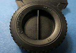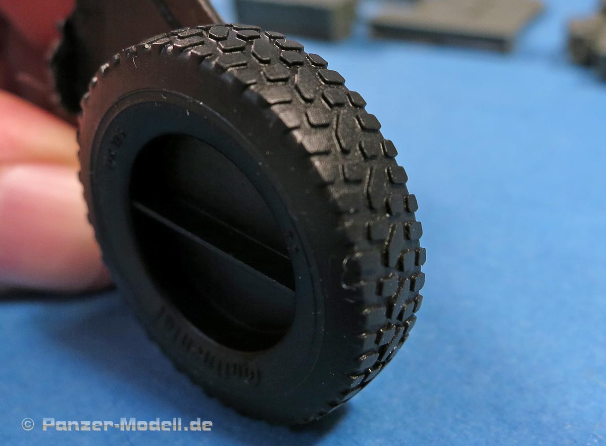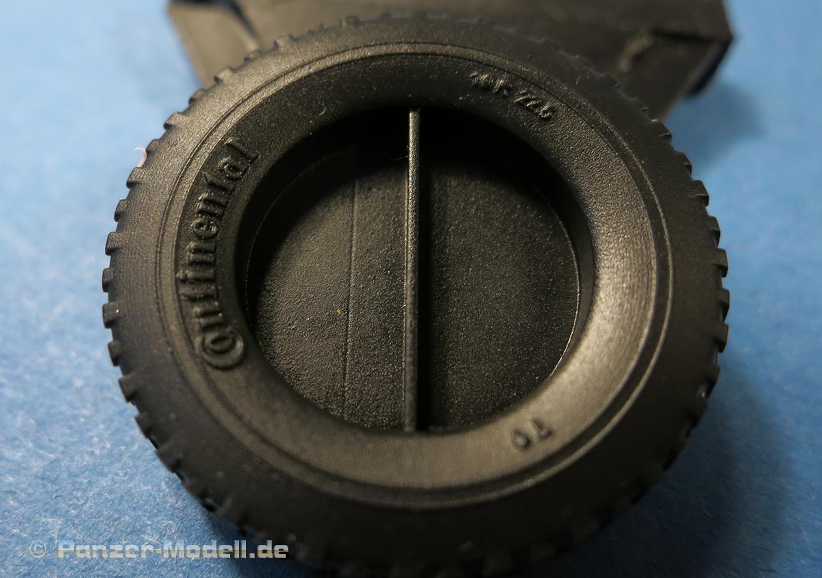 Die in schwarz gegossenen Reifen weisen sogar Herstelleraufdrucken von Continental an den Flanken auf und das aktuelle Profil. Diese sit schön und scharf detailliert - die Profileinschnitte an den Seiten könnten eine Idee tiefer sein, wie insgesamt das Profil auch - aber so stellt es halt kein nagelneues Profil dar und somit realistischer.