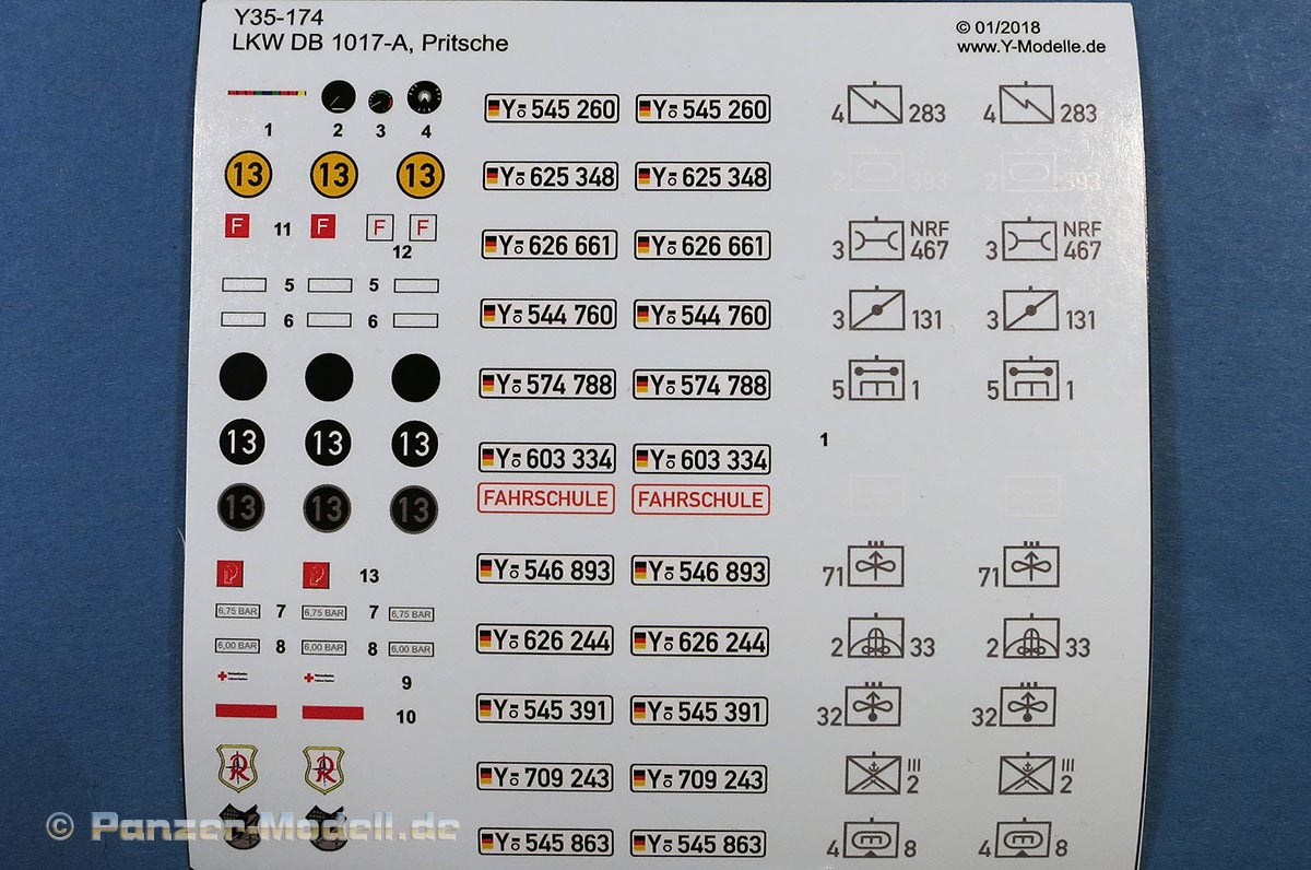 Der Decalbogen ist mal richtig ein Knüller und hier können sich einige Hersteller mal eine dicke Scheibe abschneiden, wie man einen Decalbogen mit Auswahlmöglichkeiten gestaltet. Sauber und sehr detailliert gedruckt gibt es hier die MLC Schilder in 4 Varianten, Decals für das Armaturenbrett, Markierungen für Feuerlöscher, die Druckangaben für die Reifen in weiß und fehgrau, sowie je zwei Wappen vom Jagdgeschwader 71 "Richthofen" und Jagdbombergeschwader 32.